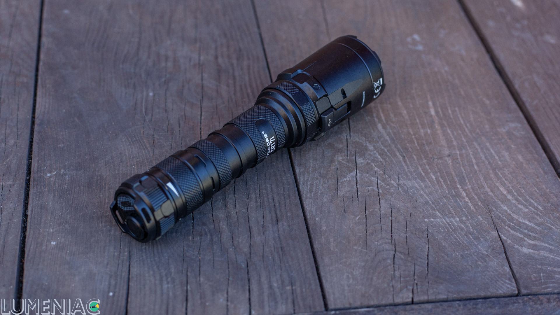 Кроме кольца за управление отвечает стандартная для тактических фонариков связка из двух кнопок. Отмечу что более высокая кнопка питания имеет два положения срабатывания, что значительно повышает гибкость использования.