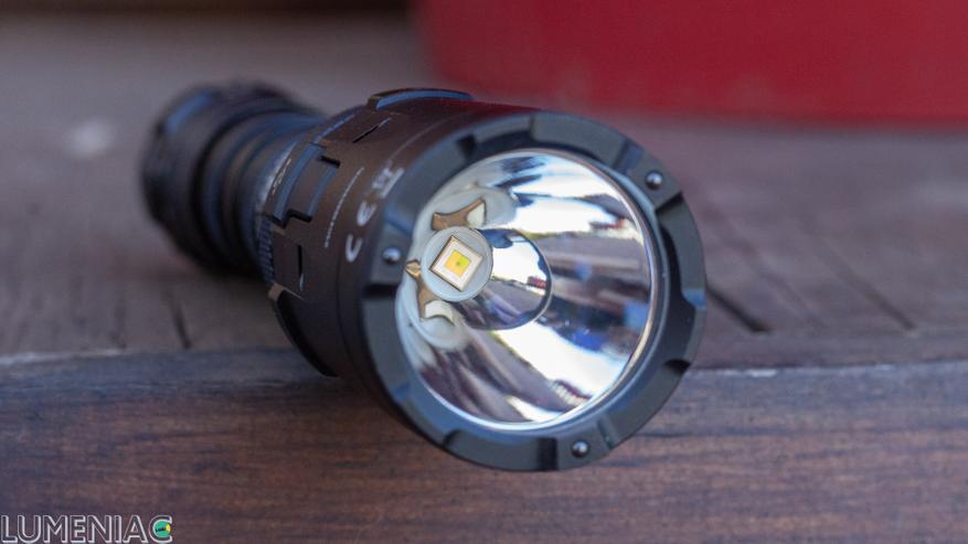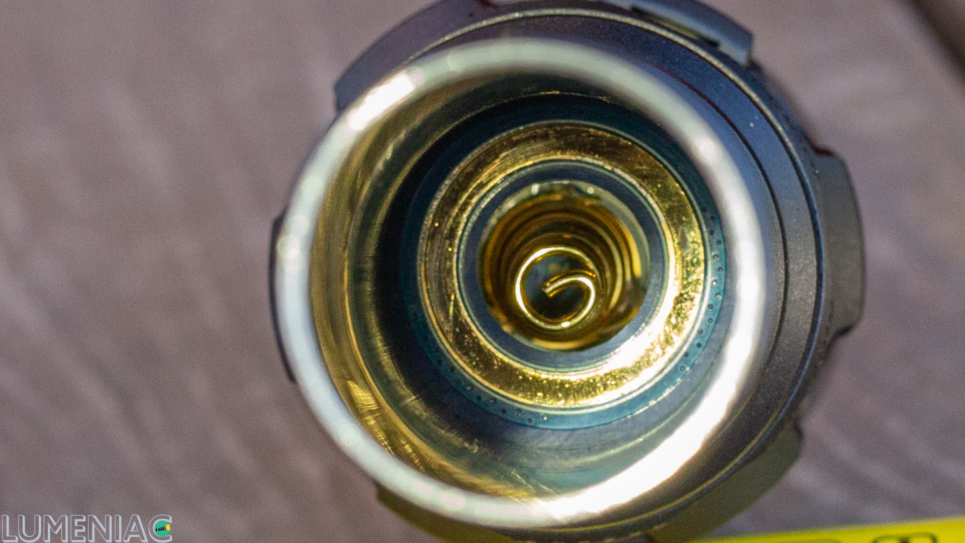 Рефлектор, достаточно глубокий и гладкий. На его дне находится весьма приятный по сочетанию яркости и дальнобойности Luminus SFT70 светодиод. На фото кажется что он не отцентрован, но это не более чем неудачный угол.