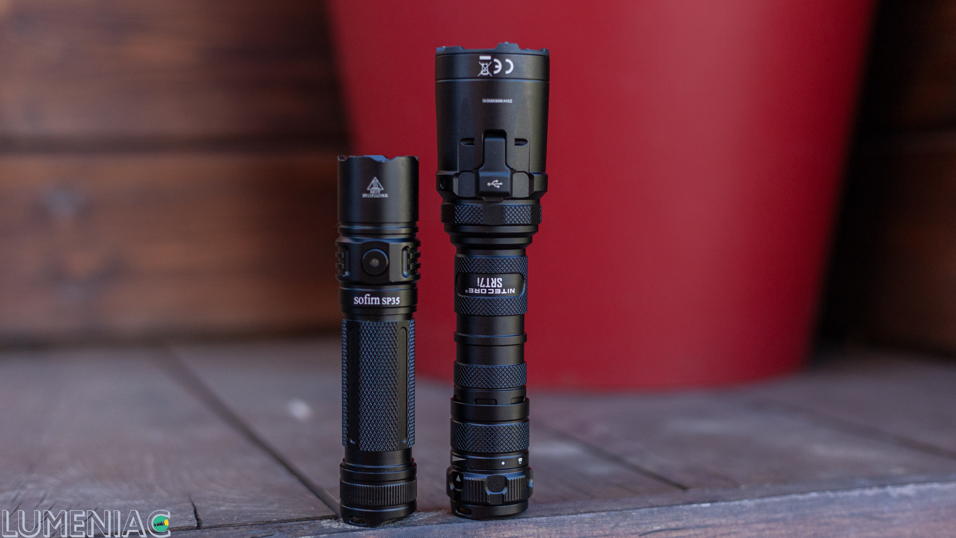 Nitecore SRT7i — достаточно крупный тактический фонарик и он существенно больше даже такого крупного по EDC меркам фонарика как Sofirn SP35. Впрочем, не то, чтобы Nitecore SRT7i на самом деле большой, просто есть модели с менее выделяющейся головой. А вот, к примеру, по меркам дальнобойных фонариков, он совершенно среднеразмерный.