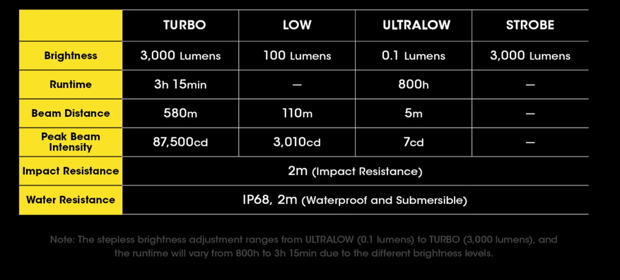 - максимальная яркость и дальнобойность 3000люм и 580м (87500кд)