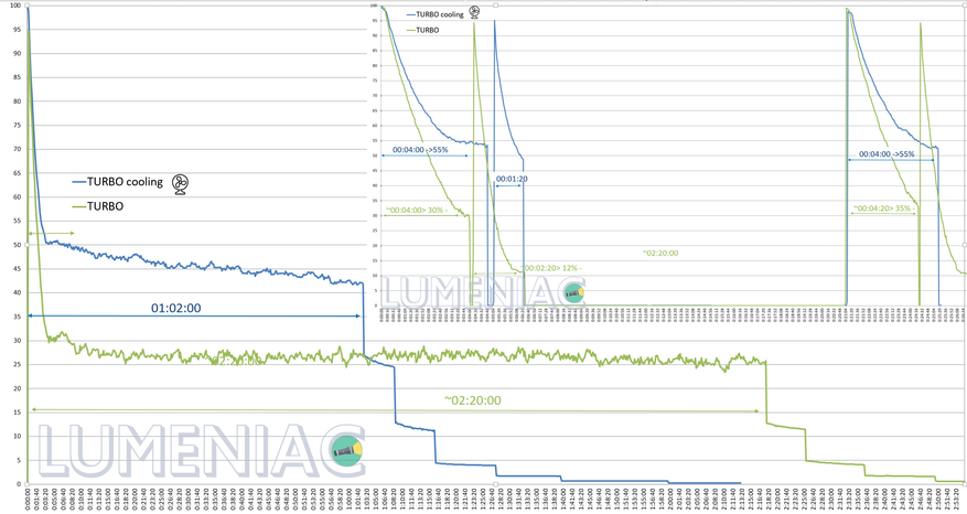 Даже с охлаждением фонарик не держит турбо и секунды, яркость начинает моментально пикировать вниз. Впрочем, с охлаждением яркость падает до отличного уровня порядка ~50% (т.е. условных 1500люм) и до приемлемого уровня в 25% (т.е. ~750люм). И, что важно — падение длиться 4 минуты и я уверен что этого времени хватит уж точно.