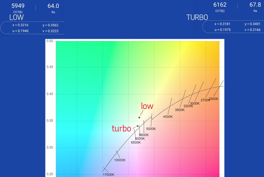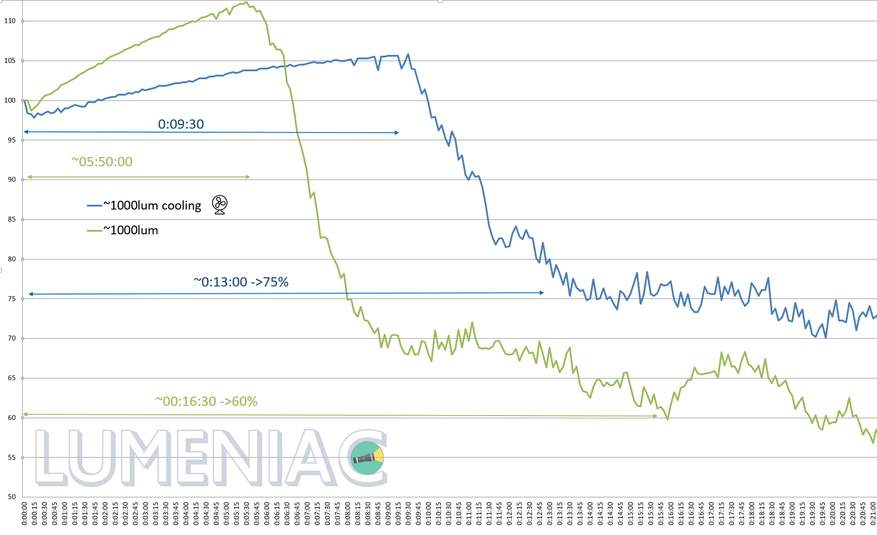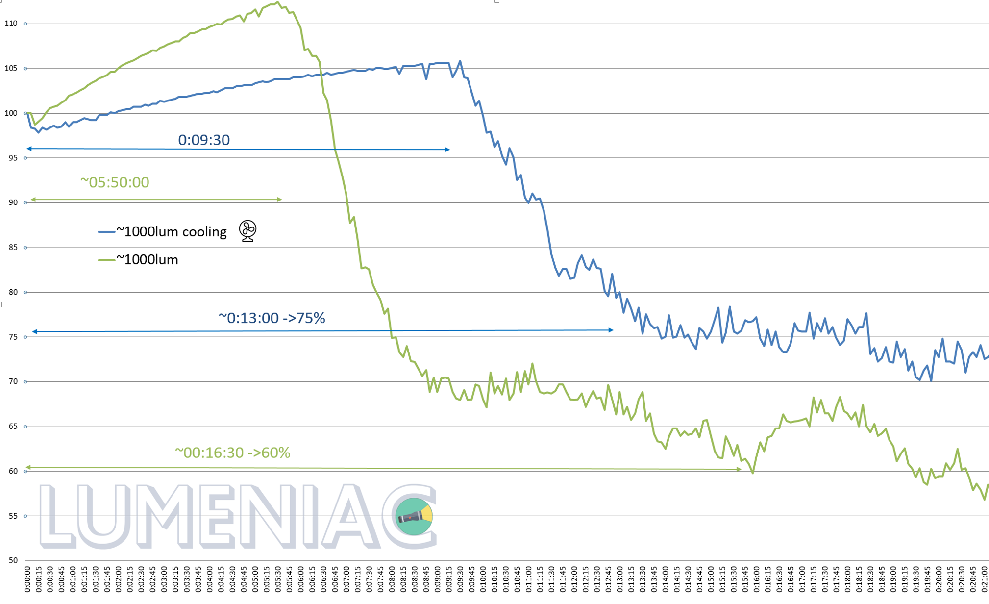 Я попытался поймать уровень где-то в 1000люм (1\3 от турбо) и вот что у меня получилось. Фонарик отлично реагирует на охлаждение. У меня нет никакого объяснения почему после падения яркости из турбо фонарик держит 1\2 этого режим, и не держит 1\3, если включить эту яркость отдельно.