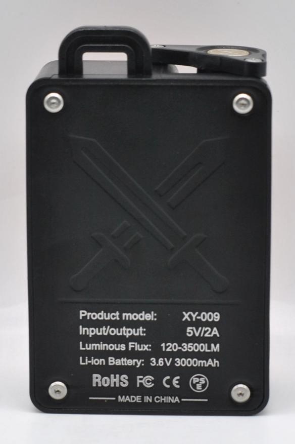 Основной корпус пластиковый, передняя и задняя крышки алюминиевые. Спереди огромный (3,2 см) излучатель света с кольцом светящимся зеленым после использования, закрыт выпуклым акрилом. На задней крышке Crossed Swords — скрещенные мечи (хорошо хоть не струи), что символизируют на фонарике не особо понятно.