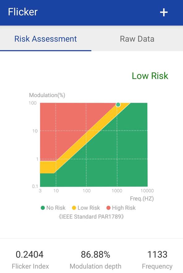 Что видим: индекс CRI не высокий, температура света регулируется в пределах 2800-6000 К, на минимальной яркости пульсации света почти на грани безопасности, на яркости выше — пульсаций уже нет.