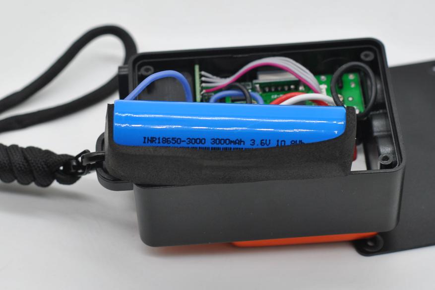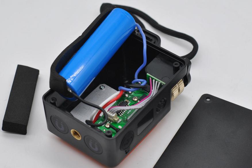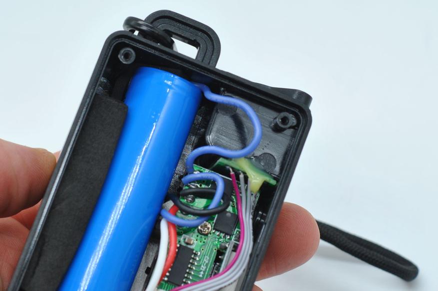 Аккумулятор заявленной емкости (хотя места почти на два таких), есть пластина — радиатор для светодиодов. А чтобы не болталась плата энкодера, пришлось добавить каплю клея. Как видим, резиновой прокладки по периметру задней крышки не наблюдается — в воду фонарь лучше не опускать.