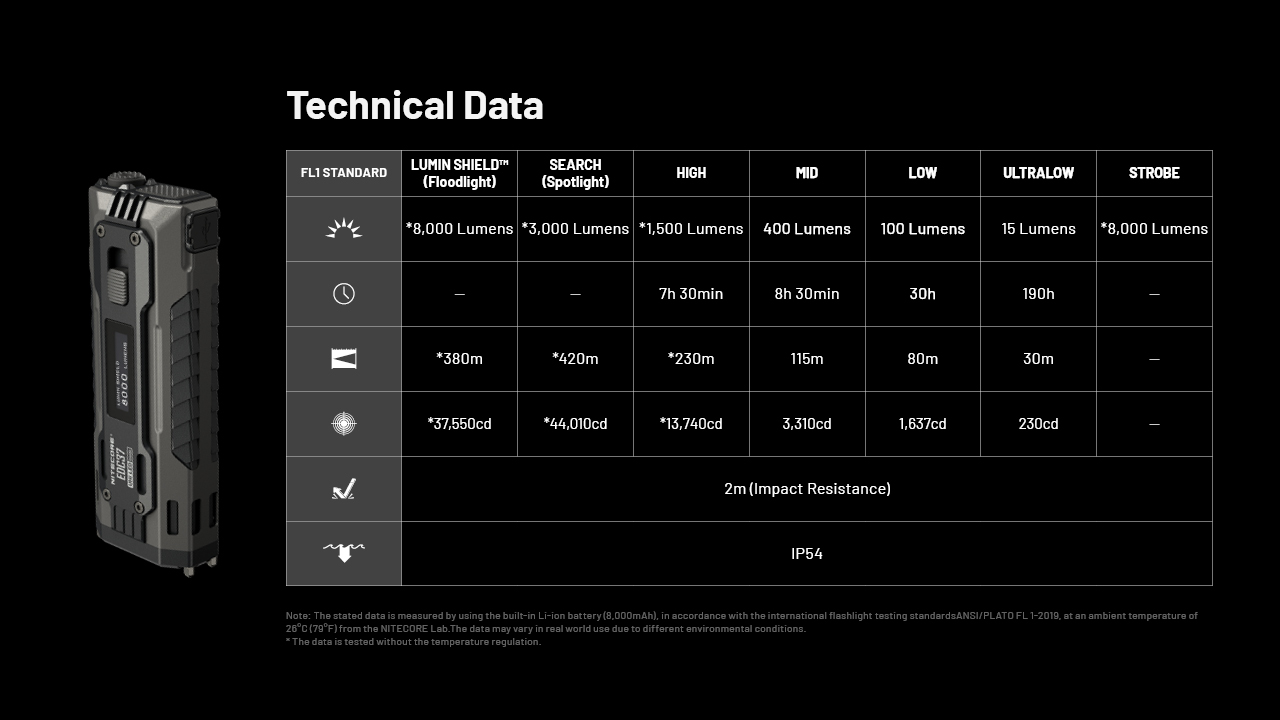 Модель предлагает четыре предустановленных режима: 15, 100, 400 и 1500 люменов. Максимальная яркость в 3000 и 8000 люменов активируется через отдельную кнопку, но эти режимы доступны только кратковременно из-за сильного нагрева. В экономичном режиме (15 люменов) фонарь способен работать до 180 часов, а при 1500 люменах — до 7,5 часов.