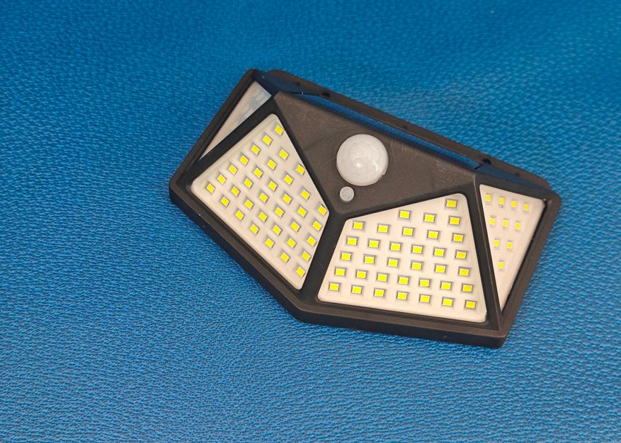 Темнеть на улице стало раньше, жена уговорила купить и установить вот такой наружный светильник — на аккумуляторной батарее с подзарядкой от солнца. Все просто — днем заряжается, ночью освещает, если кто-то проходит рядом. Что еще можно сказать — это два режима (яркий и половина яркости) и 100 светодиодов, которые размещены на четырех панелях.