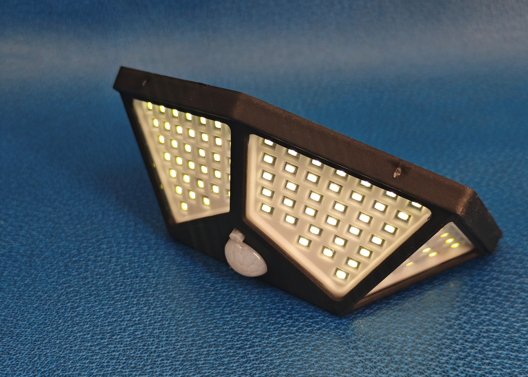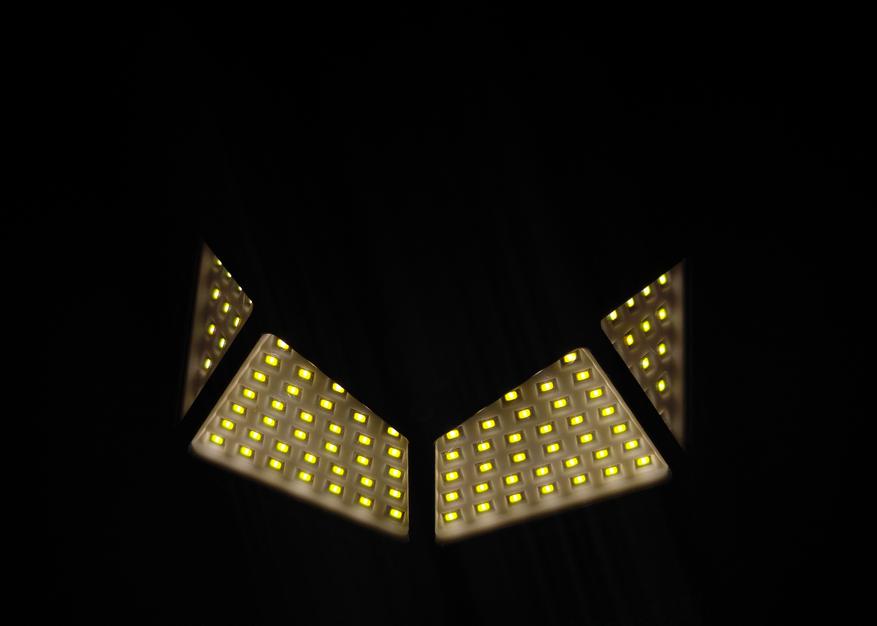 За счет большого количества светодиодов (100 штук) и их размещения на отдельных панелях, расположенных под некоторым углом друг к другу, получается широкий угол освещения до 270 градусов. Пластиковая накладка на светодиодной панели выполняет роль отражателя, рассеивая свет.