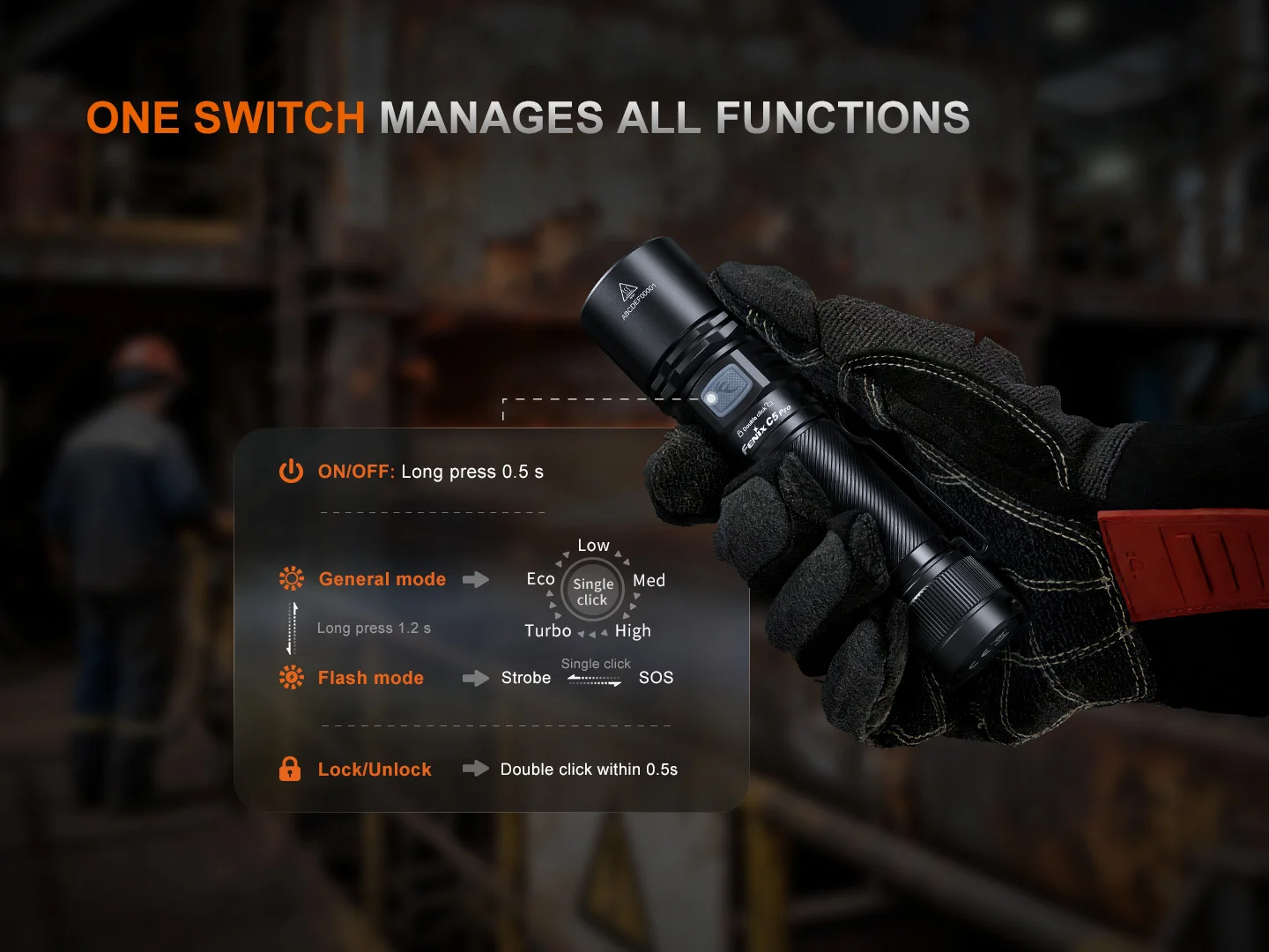 Fenix также заявляют для фонарика драйвер постоянного тока для поддержания яркости на одном уровне. Кроме постоянного света в фонарике есть состоящий из стробоскопа и SOS режим вспышки. Остальные уровни яркости и дальнобойность: