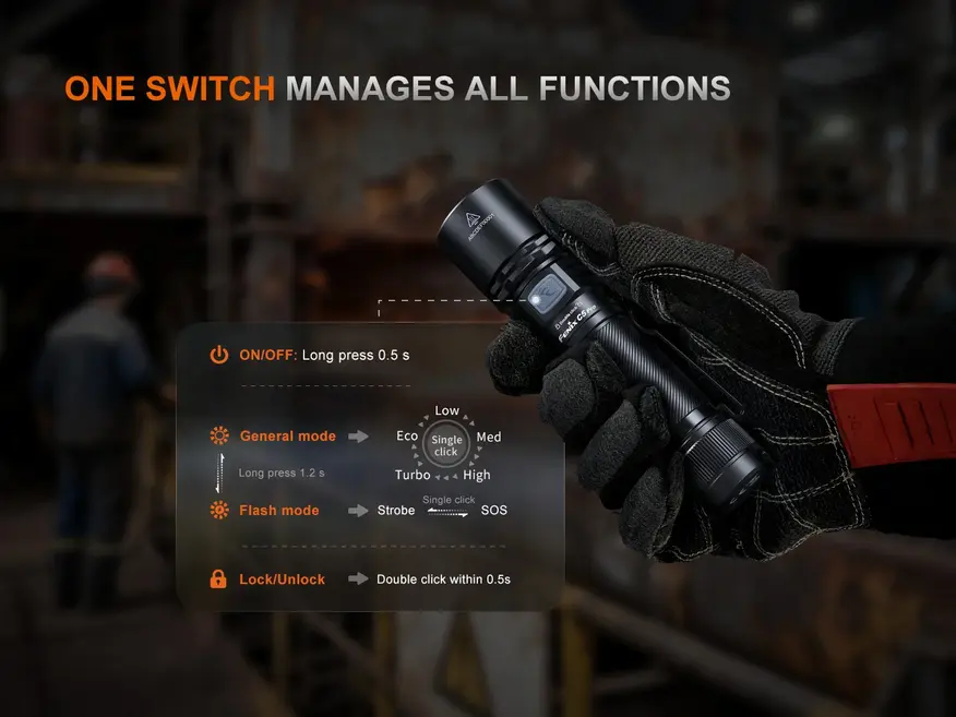Для управление фонарика используется боковая кнопка. Она расположена на противоположной от USB-C разъёма зарядки стороне и также работает как стандартный красно-зеленый индикатор уровня заряда и состояния процесса зарядки. Интерфейс обычный для Fenix, с перемоткой режимов по нажатию на кнопку и ВКЛ-ВЫКЛ по её долгому удержанию. Кроме того есть (раз)блокировка по двум быстрым щелчкам в пределах 0.5 секунд.