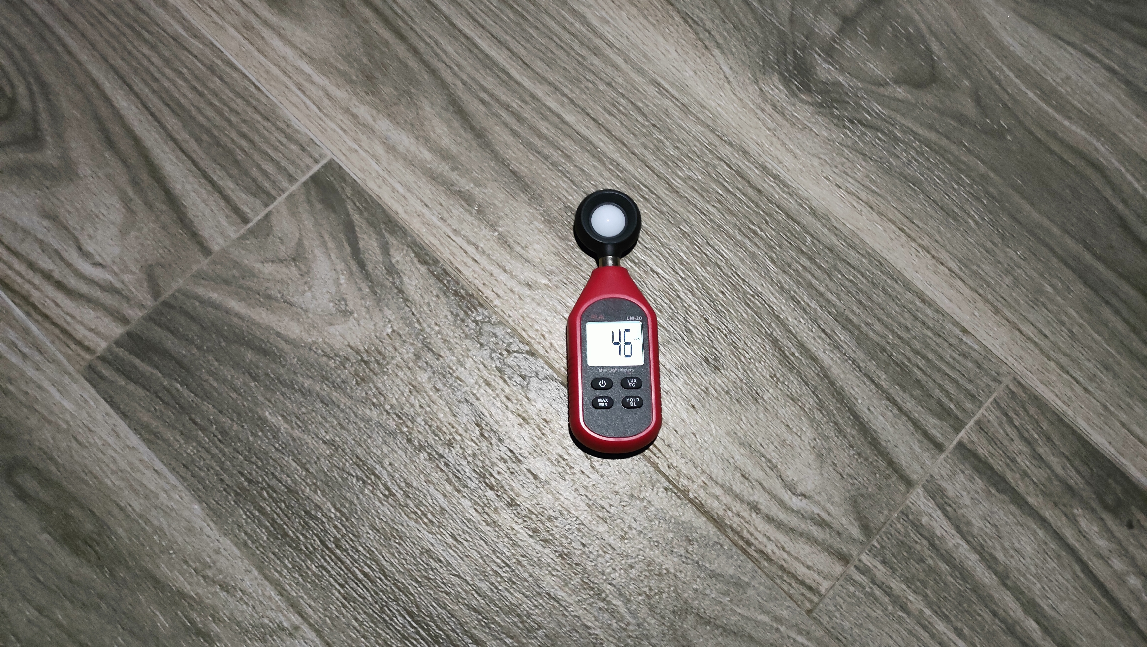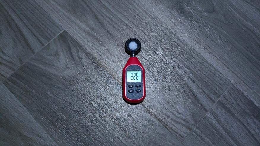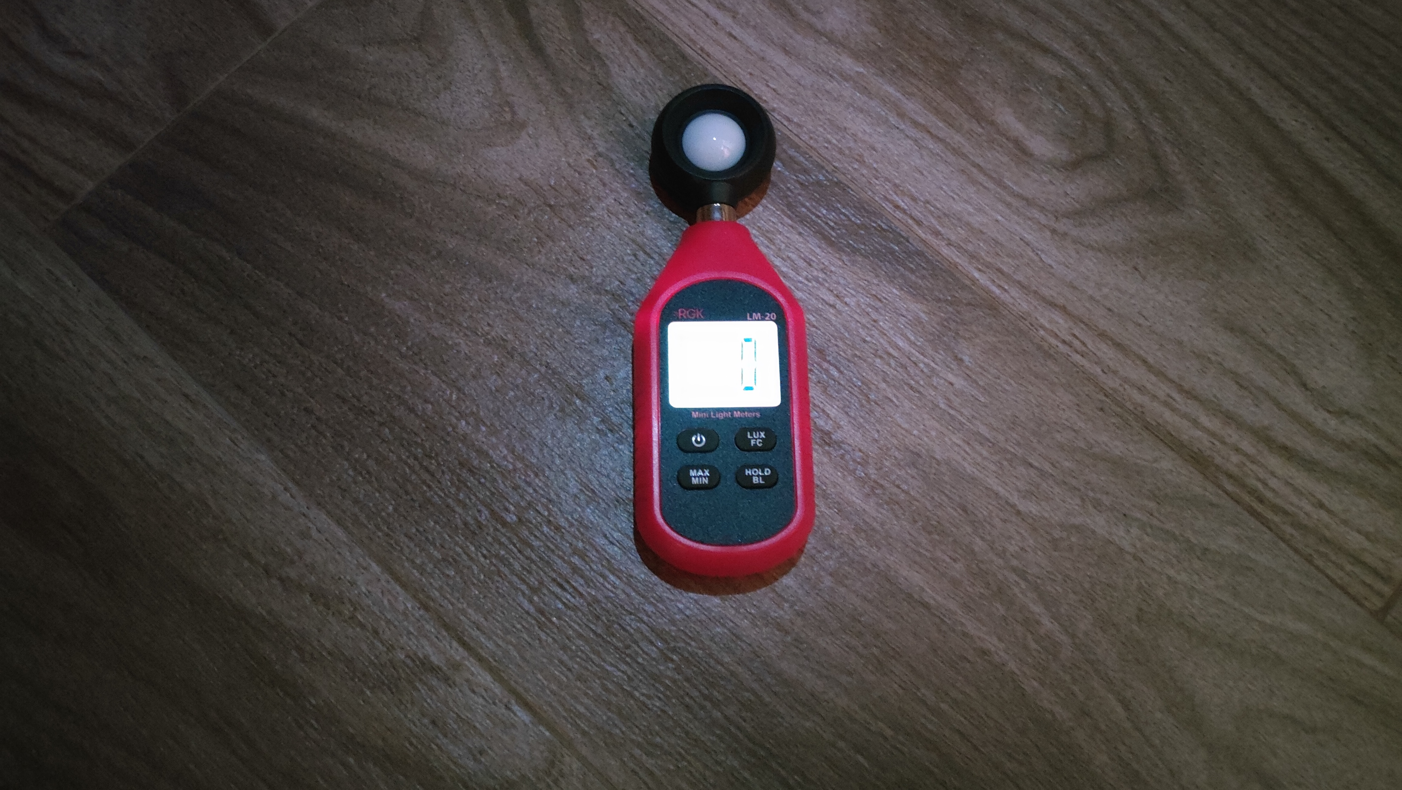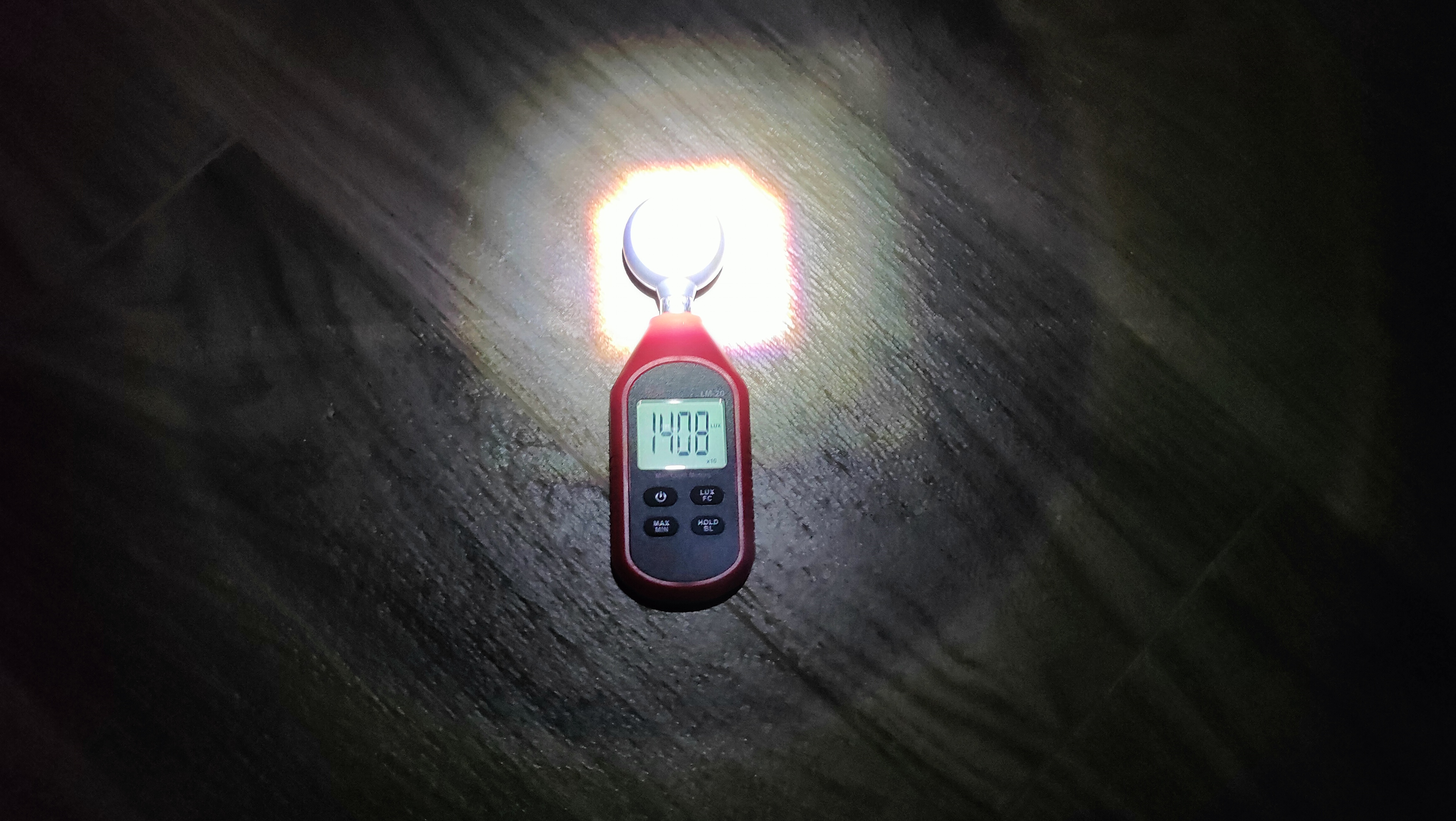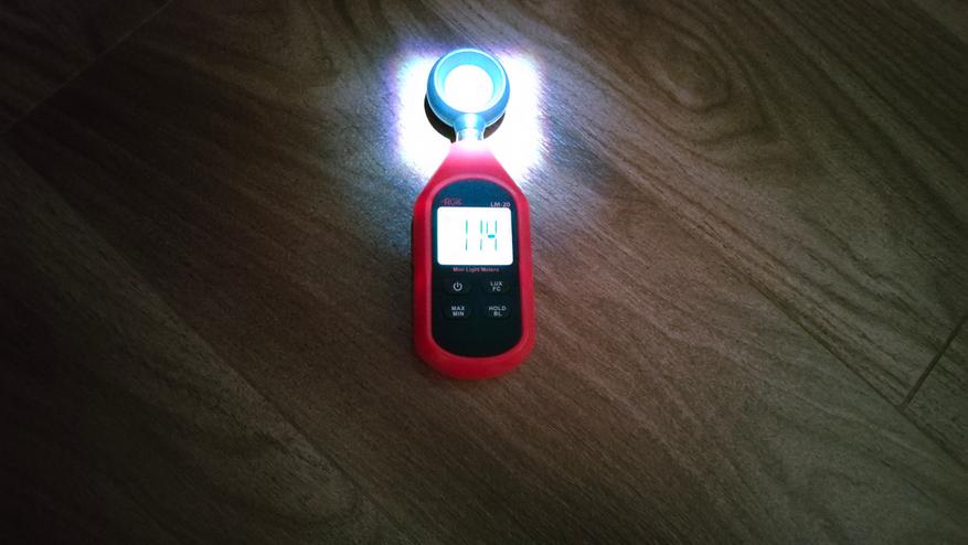 Для любителей сухих цифр приведу замеры яркости всех трёх режимов на расстоянии 1 м на полностью заряженном аккумуляторе и спустя заявленные 8 часов. Два менее ярких режима не смогли дать никаких чисел на приборе.