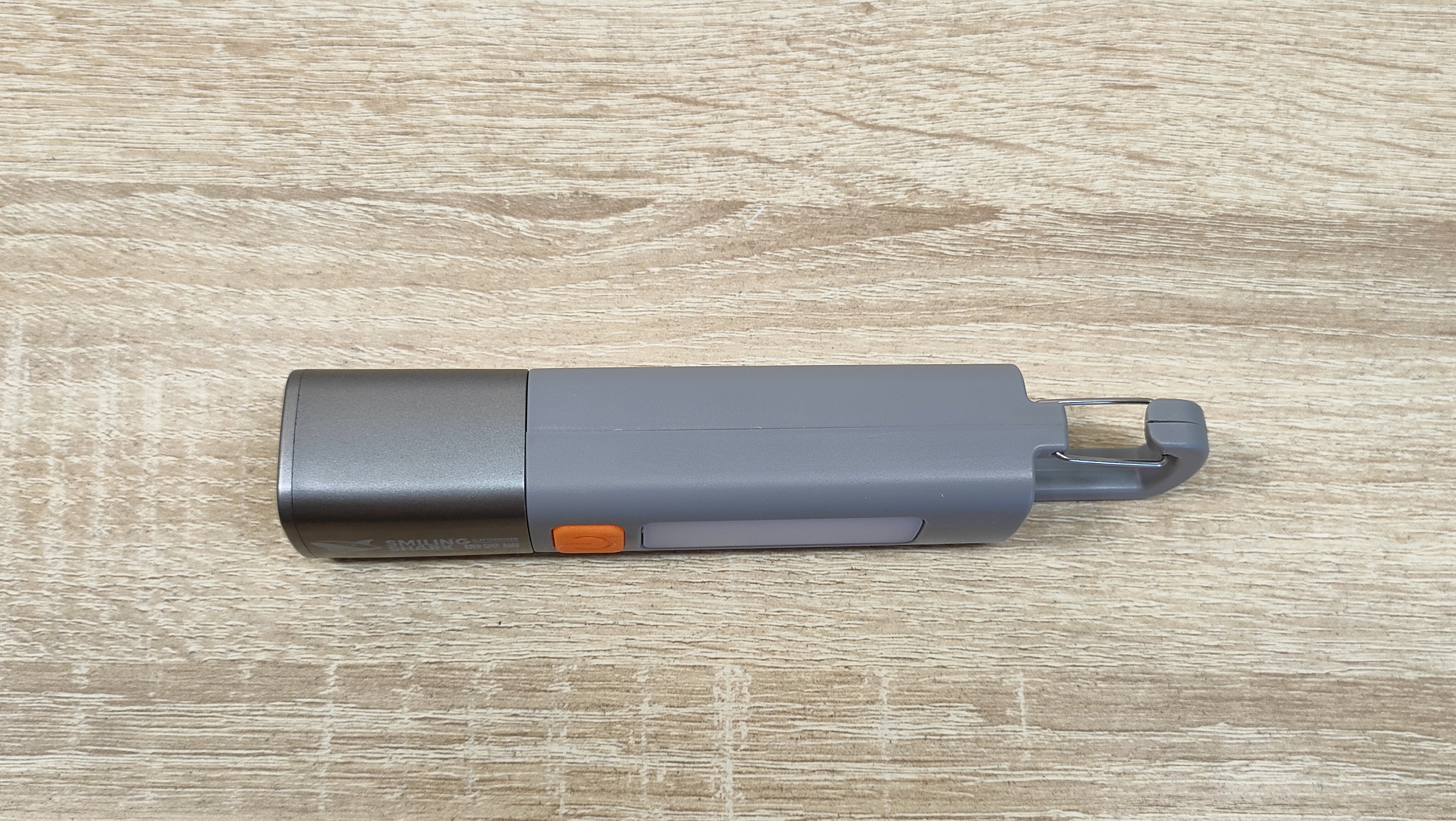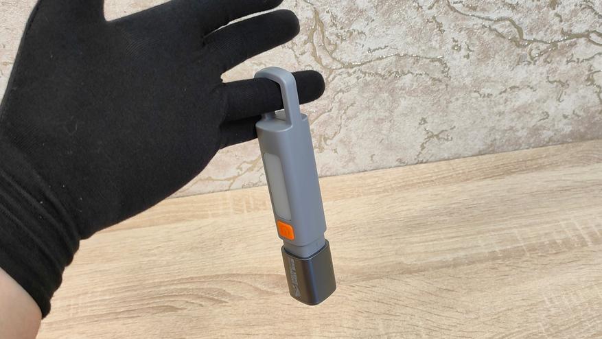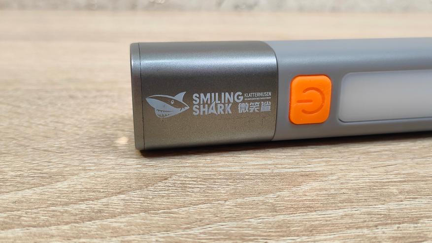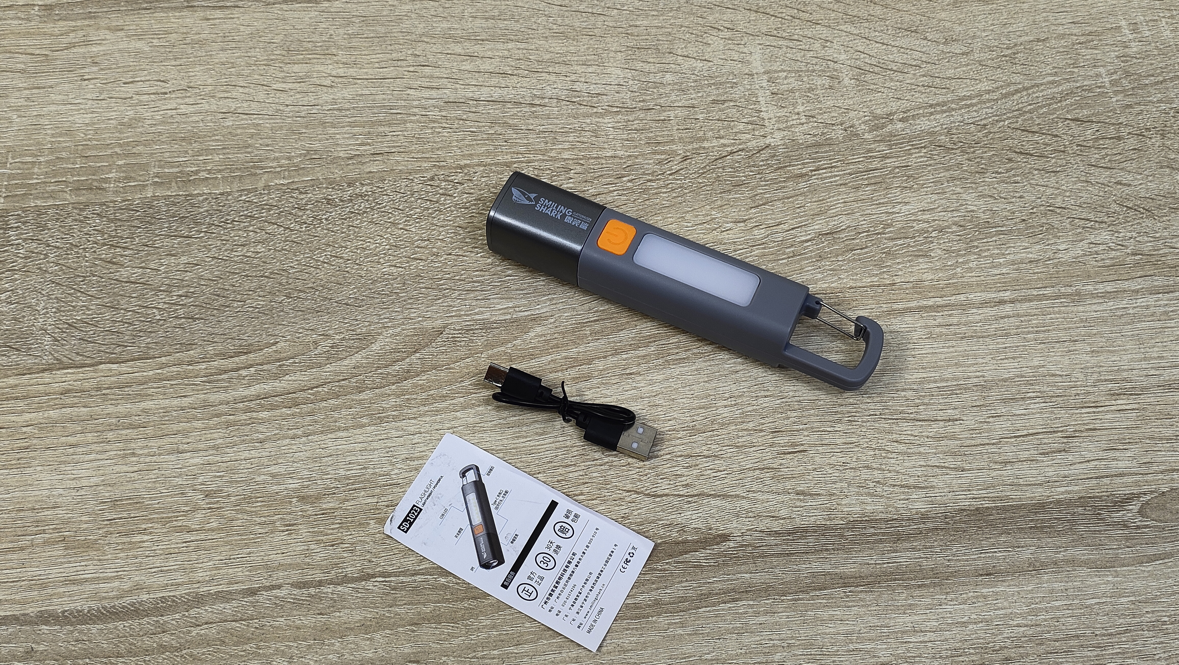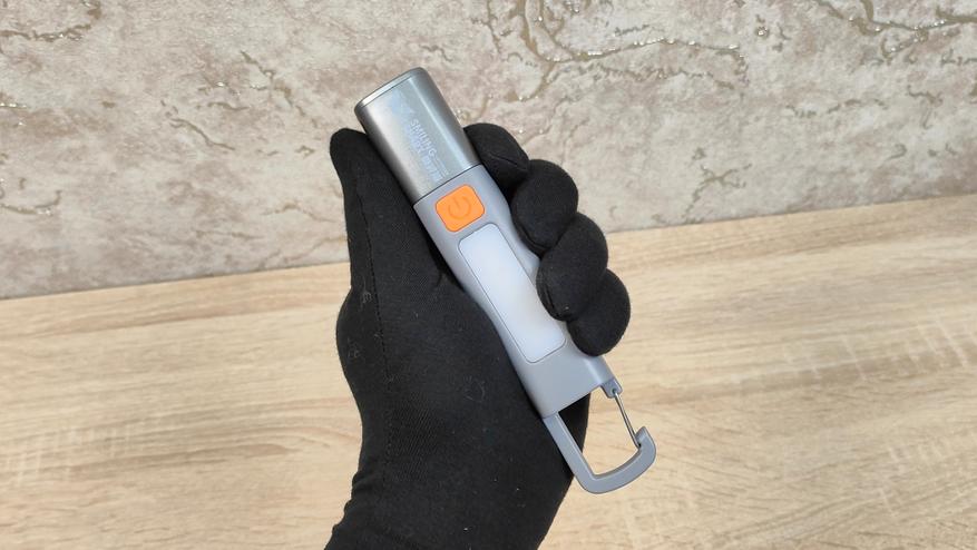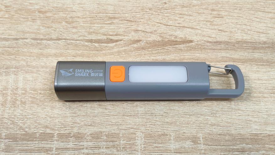 Каких-либо элементов взаимодействия у него немного, линза которую можно двигать ближе-дальше, тем самым рассеивая свет или концентрируя его в пучок, в последнем состоянии, появится доступ к спорту зарядки USB Type-C. На одной из граней видна кнопка включения-выключения, а под ней есть COB-матрица с рабочим светом, ну, или, кемпинговым светом, так как на конце у него есть карабин, простенький, но есть. Собственно, кроме того, на корпусе линзы есть изображение акулы и надпись,