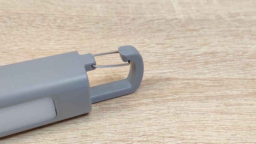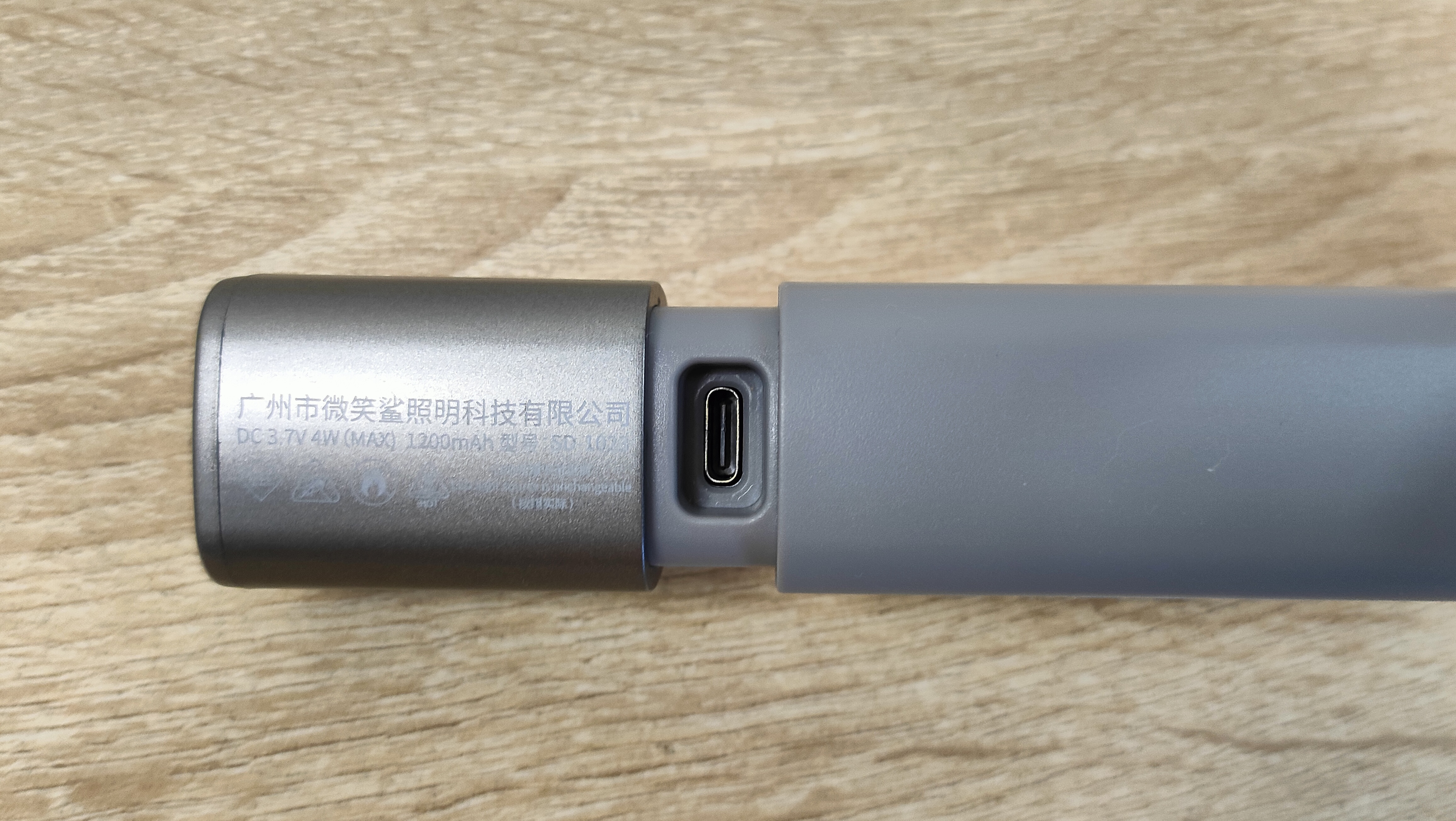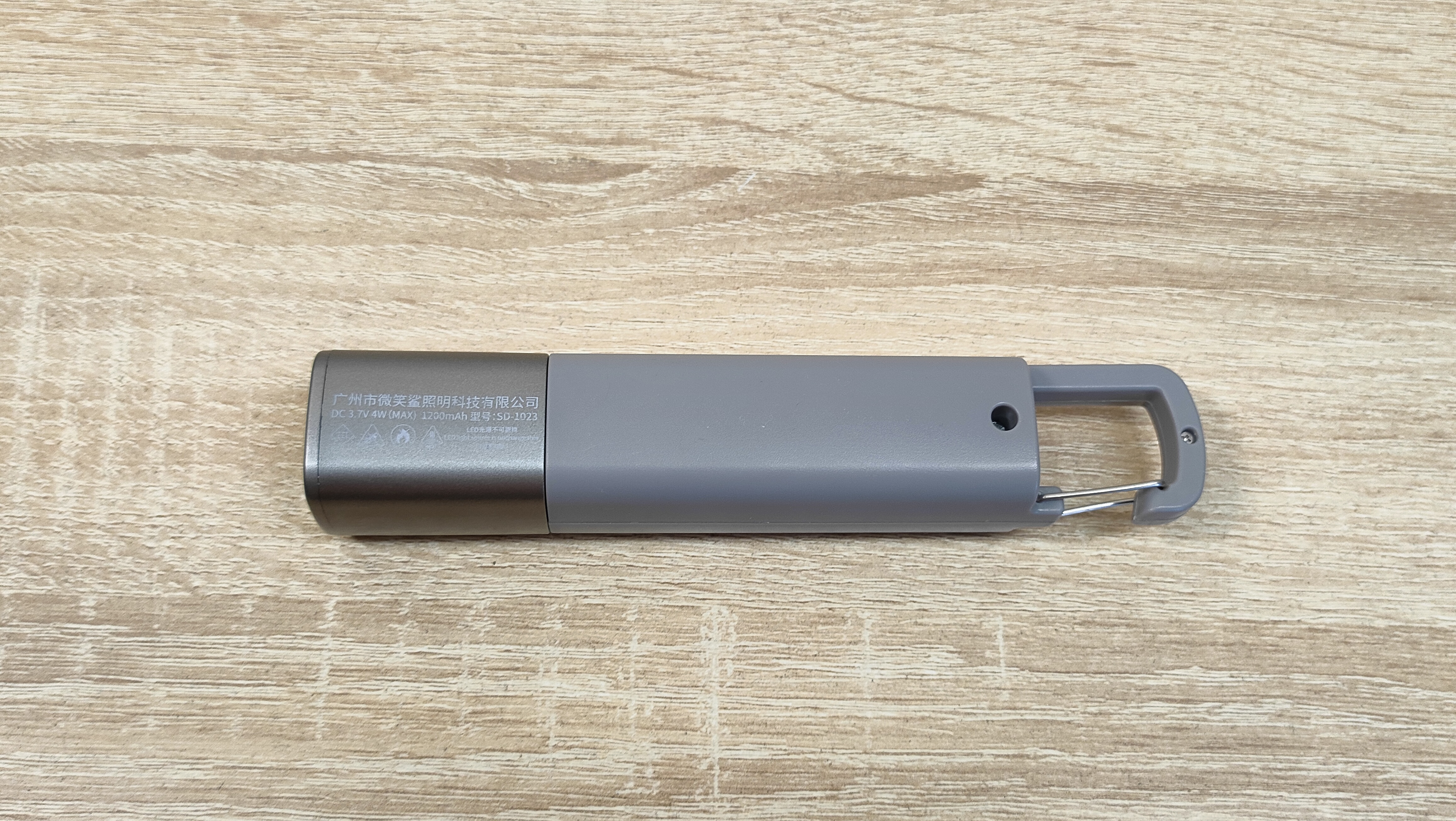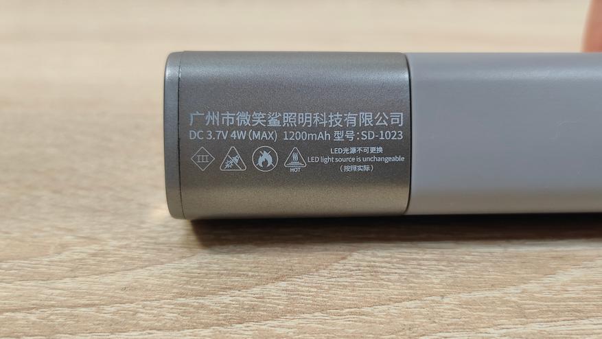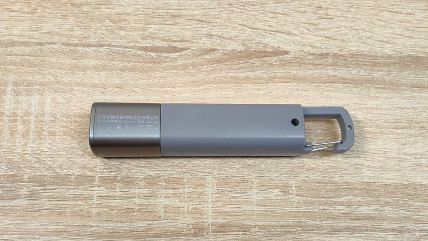 Каких-либо элементов взаимодействия у него немного, линза которую можно двигать ближе-дальше, тем самым рассеивая свет или концентрируя его в пучок, в последнем состоянии, появится доступ к спорту зарядки USB Type-C. На одной из граней видна кнопка включения-выключения, а под ней есть COB-матрица с рабочим светом, ну, или, кемпинговым светом, так как на конце у него есть карабин, простенький, но есть. Собственно, кроме того, на корпусе линзы есть изображение акулы и надпись,