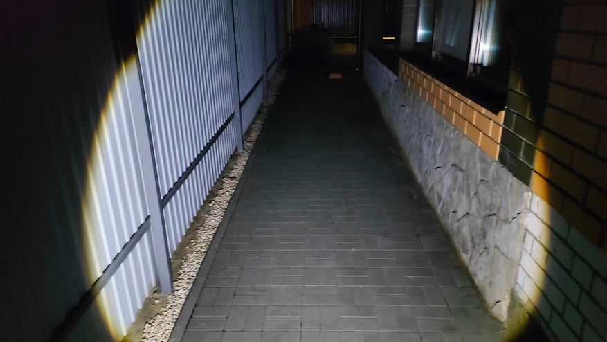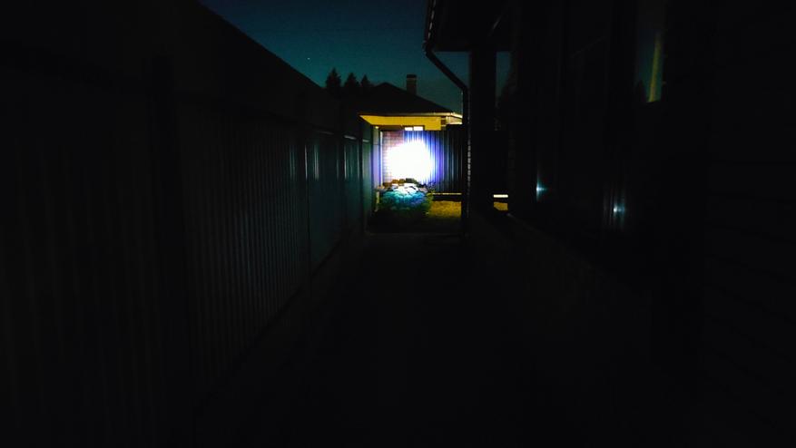 При максимальном рассеивании, фонарь даёт хорошее световое пятно, с которым комфортно ходить в тёмное время суток, так как на расстоянии 8-9 м отлично всё видно, например, кирпич лежит на плитке на расстоянии 10 метров. Кроме того, никто и ничто не мешает использовать фонарь при каких-то промежуточных значений положения линзы, например, посередине своего пути, что даст большую дальнобойность и яркость, а также световое пятно, что может быть полезно, при поиске чего-либо в темноте.