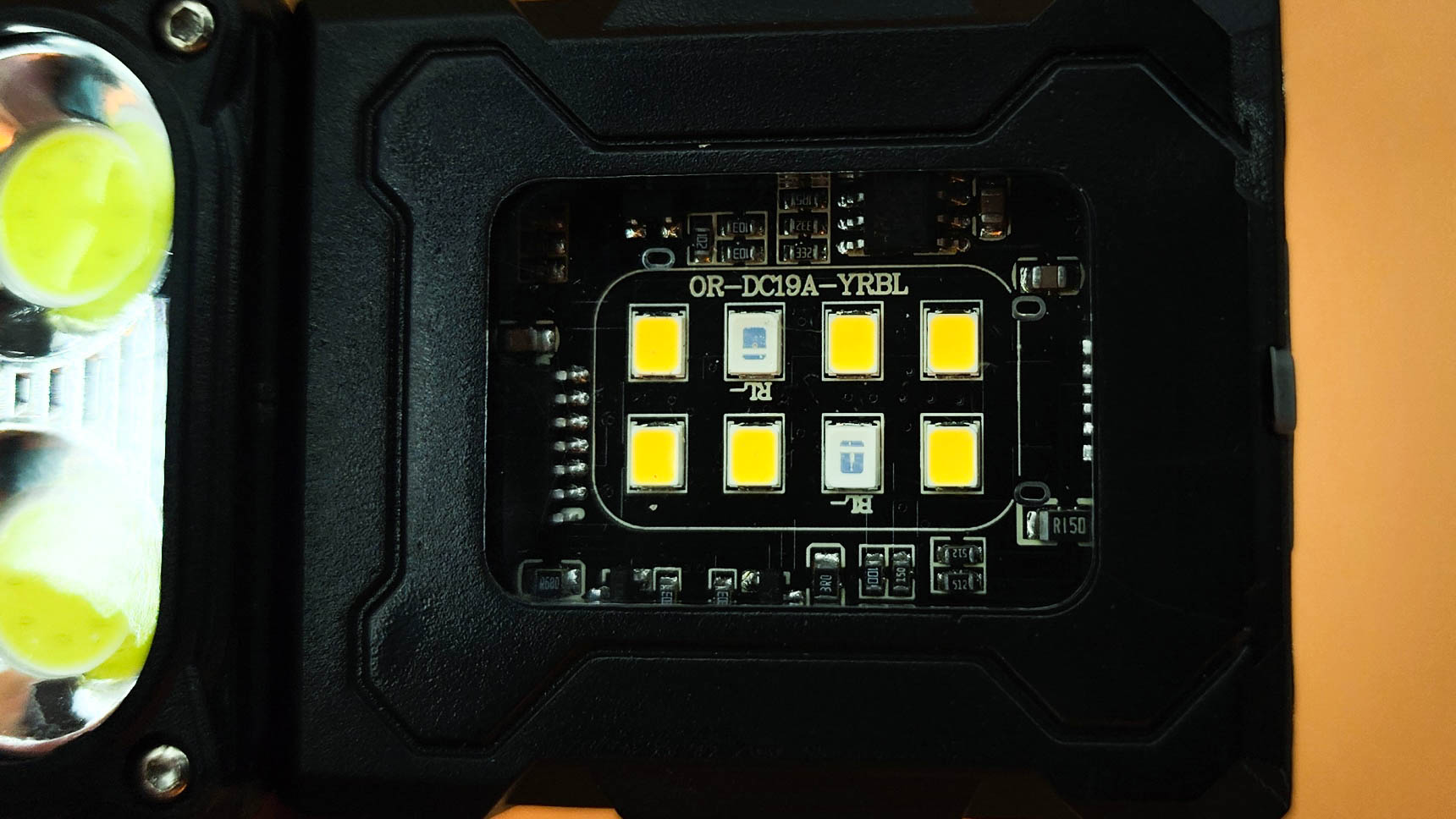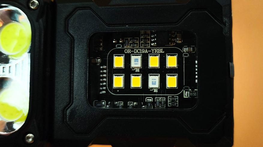 Основной свет от COB-матриц. Две компактные круглые панели расположены в голове, включаются одновременно. Дополнительная панель в виде печатной платы и 8 светодиодов: 6 теплого белого света, 1 синий, 1 красный.