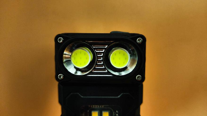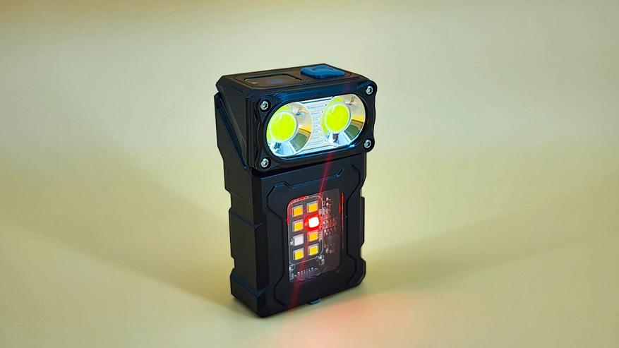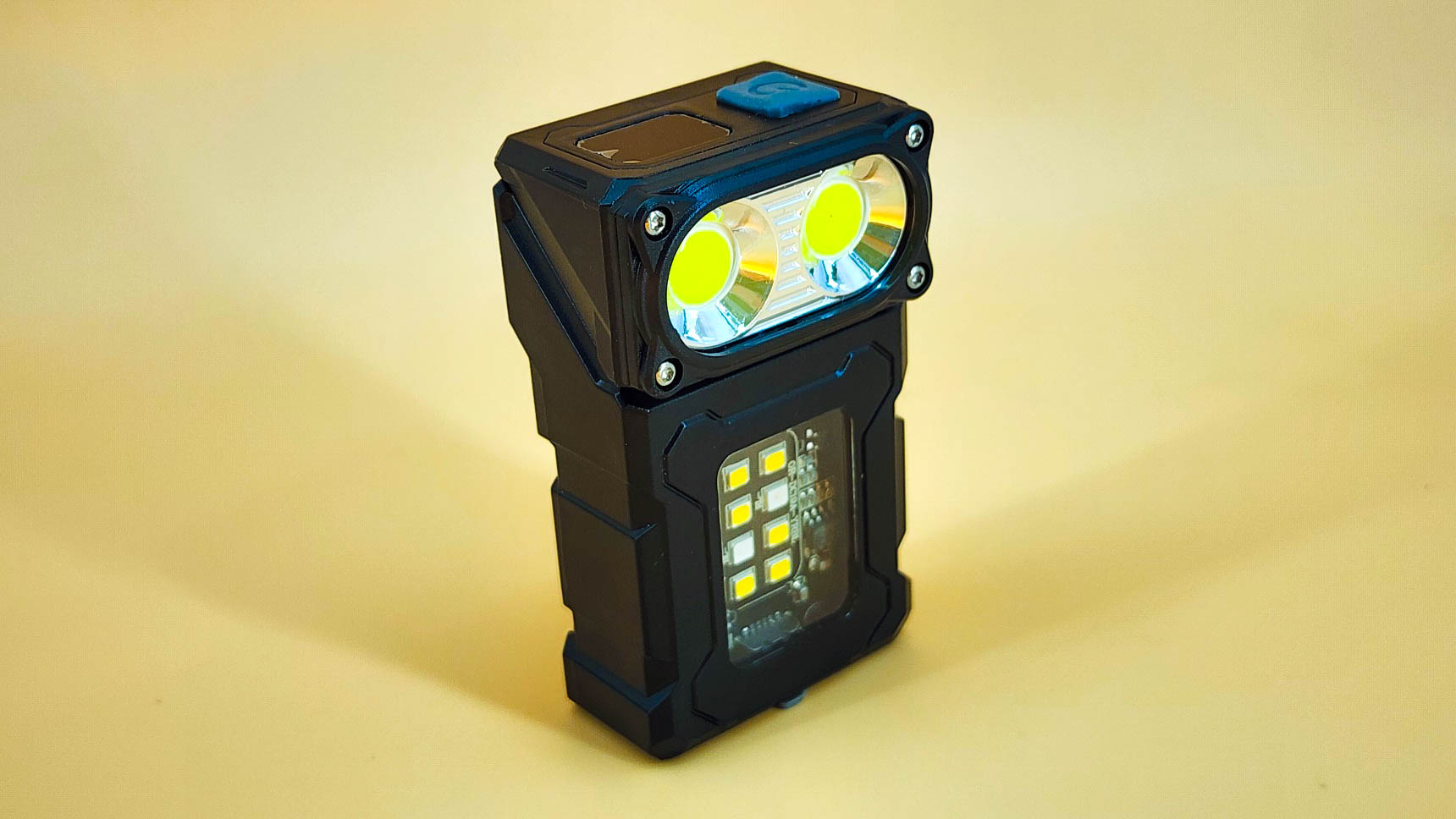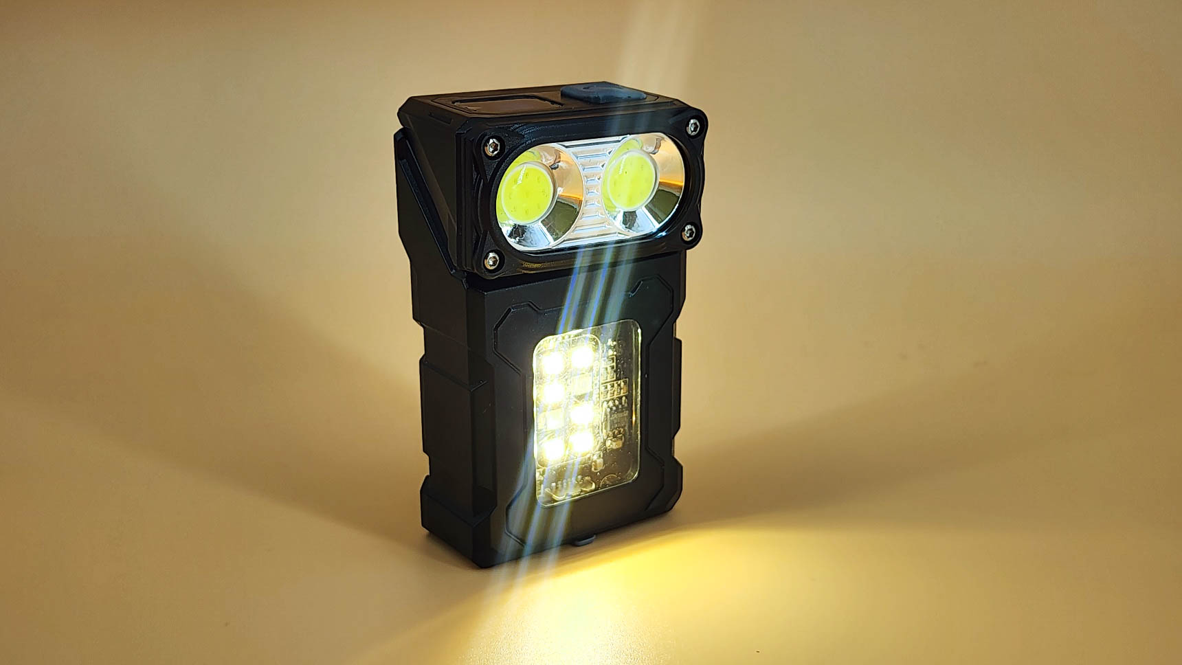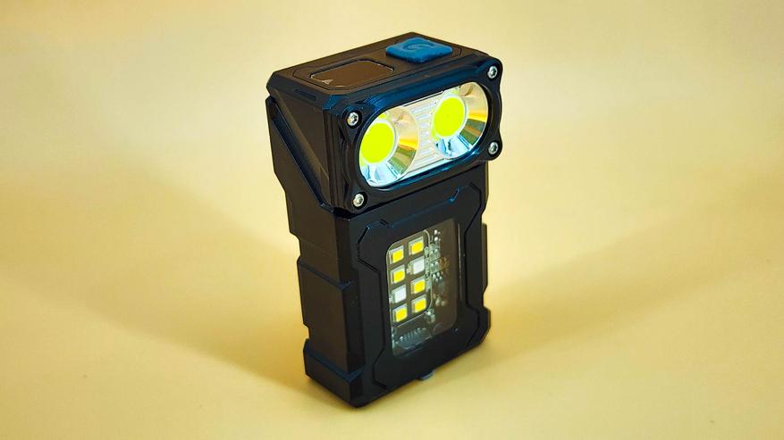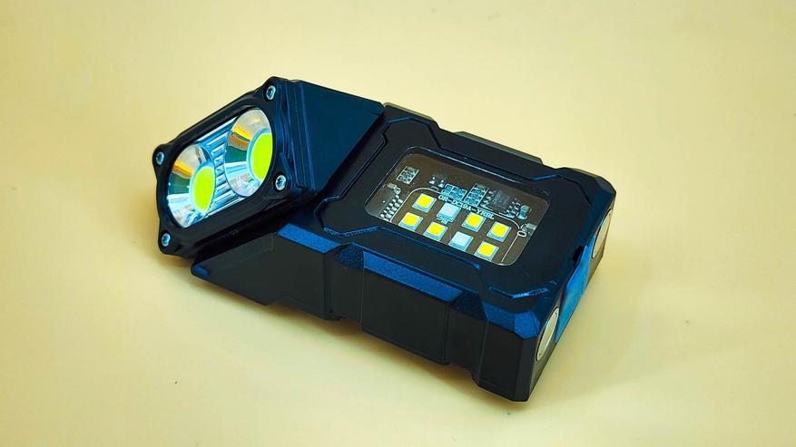 Фонарь небольшой, чуть крупнее коробки спичек (7х4 см), ощутимо толстый (около 3 см). Имеется какая-никакая защита от пыли и брызг (резиновая кнопка и заглушка), а сам корпус — из алюминия. Верхняя поворотная часть оснащается парой COB-светодиодов с рассеивающей оптикой, в центре корпуса — дополнительная светодиодная панель (8 светодиодов).