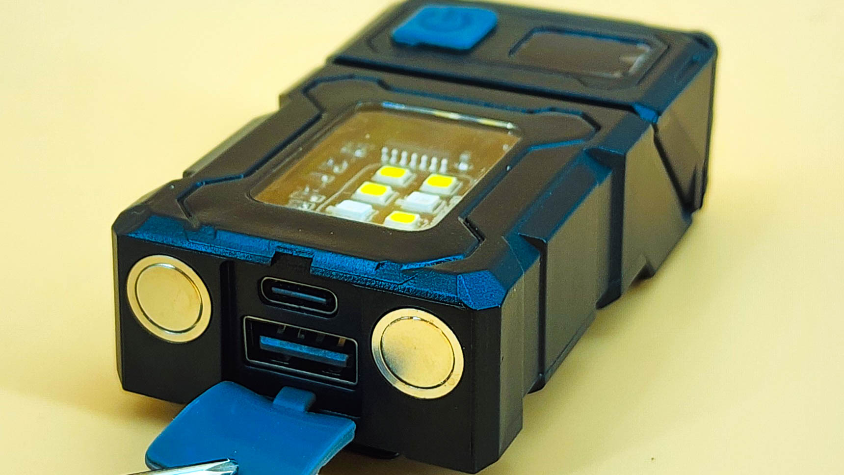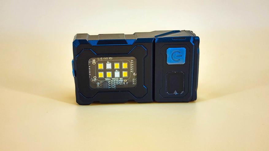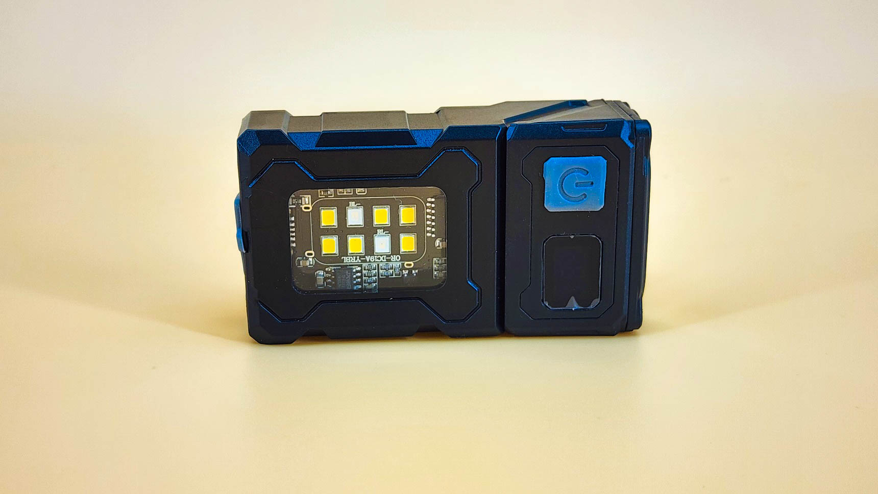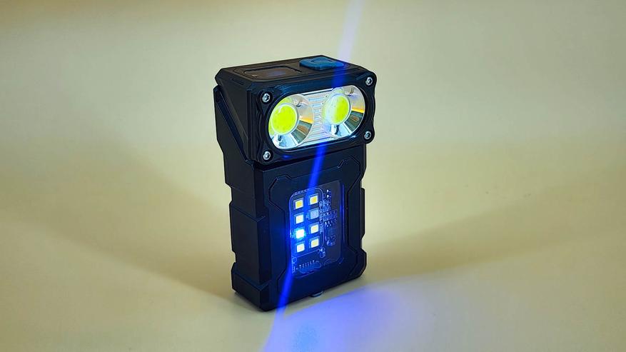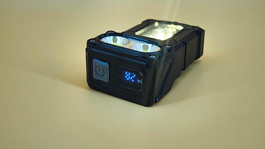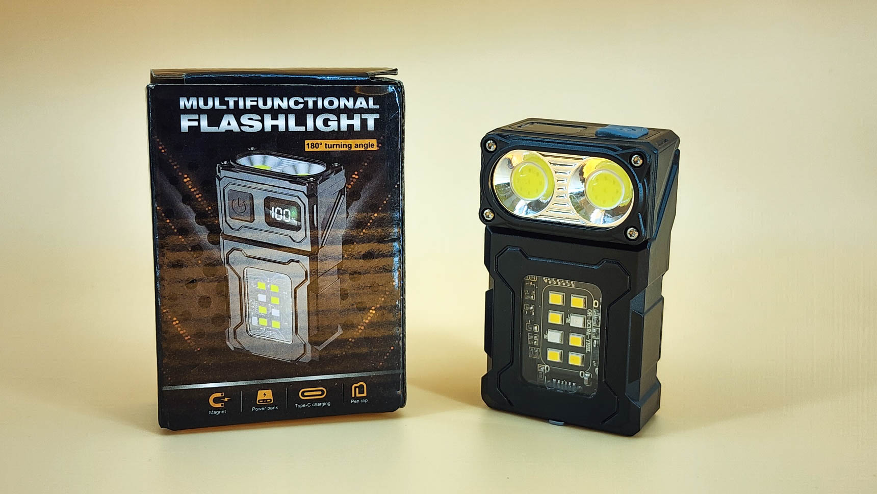 Фонарь небольшой, чуть крупнее коробки спичек (7х4 см), ощутимо толстый (около 3 см). Имеется какая-никакая защита от пыли и брызг (резиновая кнопка и заглушка), а сам корпус — из алюминия. Верхняя поворотная часть оснащается парой COB-светодиодов с рассеивающей оптикой, в центре корпуса — дополнительная светодиодная панель (8 светодиодов).