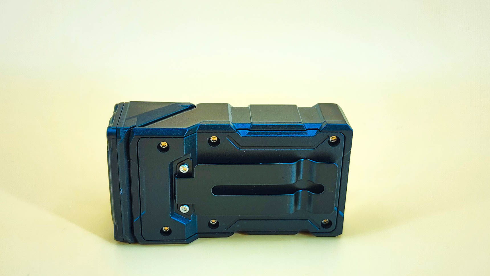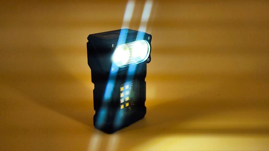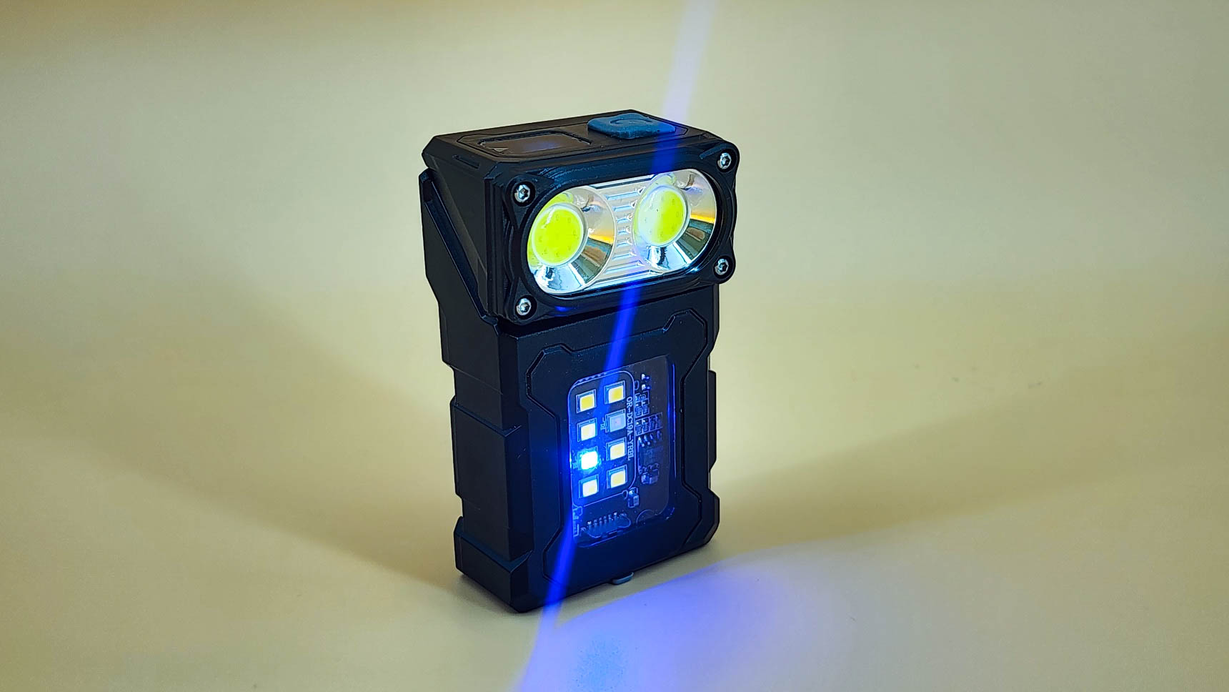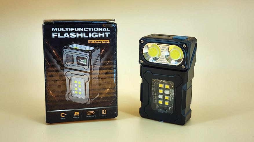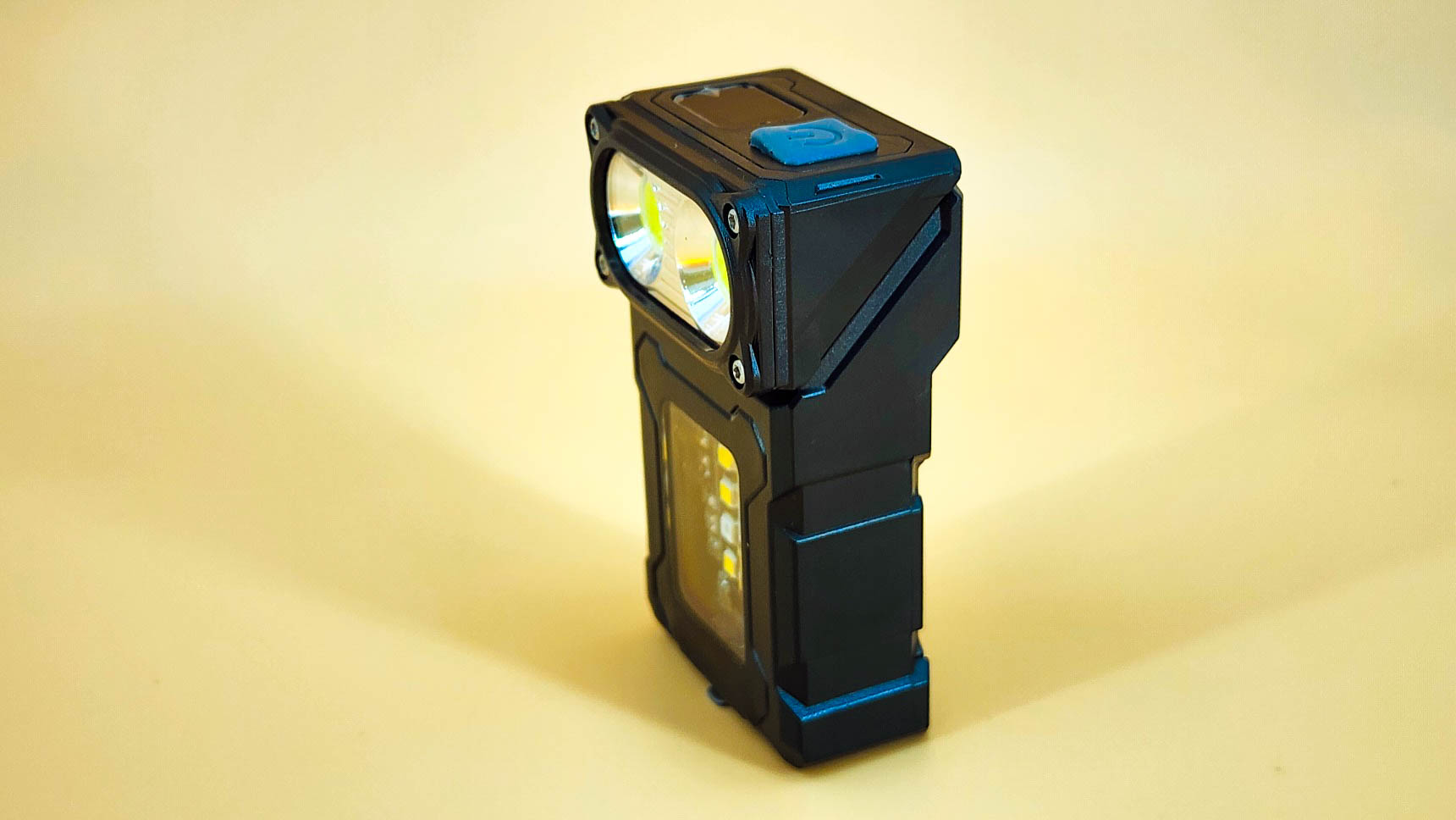Фонарь небольшой, чуть крупнее коробки спичек (7х4 см), ощутимо толстый (около 3 см). Имеется какая-никакая защита от пыли и брызг (резиновая кнопка и заглушка), а сам корпус — из алюминия. Верхняя поворотная часть оснащается парой COB-светодиодов с рассеивающей оптикой, в центре корпуса — дополнительная светодиодная панель (8 светодиодов).