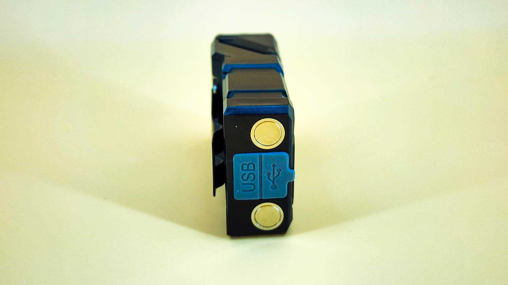 Фиксировать можно с помощью пары магнитов. Они достаточно сильные, чтобы удерживать вес фонаря в любом положении. Для такого крепления подойдет любая металлическая (магнитная поверхность). Зарядка от USB-C кабеля, есть выход USB для аварийного питания слаботочных гаджетов, но учитывая малую ёмкость самого фонаря, использовать можно в редких случаях, когда действительно это нужно. Полное время зарядки от USB — около трех часов.