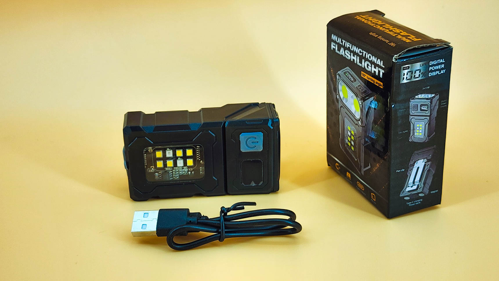 В этом обзоре рассмотрю кемпинговый фонарь с магнитным креплением, который можно использовать в разных условиях. Такой фонарь может пригодиться не только в походе, но и в гараже, на рыбалке или во время ремонта. Даже на упаковке указано, что данная модель относится к многоцелевым фонарям. Тут и индикатор заряда в цифровом виде (в процентах), и клипса на ремень, и комбинированная светодиодная панель с парой линзованных COB-светодиодов. Поставляется в небольшой картонной коробочке — нет смысла переплачивать за недорогой инструмент. Единственное — в комплекте присутствует USB-C кабель для зарядки самого фонаря.