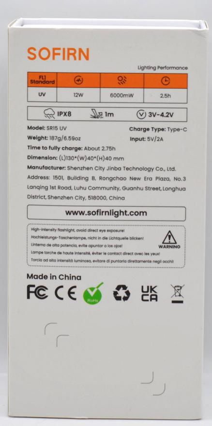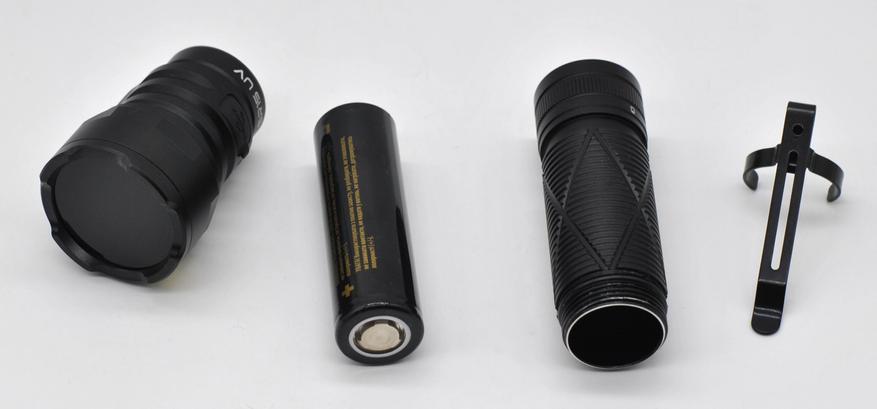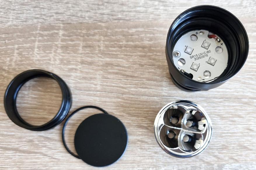 У Sofirn уже был обычный фонарь с белым светом (6000K) SR15, там использовались 4 светодиода SFT25R. Фонарь достаточно яркий (до 4500 люмен в турбо) с аккумулятором 21700. На его основе и сделали новый специализирвоанный Sofirn SR15 UV, использовав другие светодиоды (SST-08-UV-A130H-F365-00 от Luminus Devices) и ипользовава стекло Вуда (темное) в отптической системе (как светофильтр). Упростили драйвер до одного режима. SR15 UV уже может далеко посылать УФ излучение мощностью 6000 мВт. Это на два порядка больше чем у наключных фонарей с УФ светодиодом, которые обычно используют для проверки подлинности банкнот.