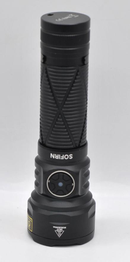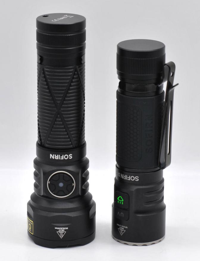 Сравним размеры Sofirn SR15 UV с SR23 от того же бренда (там помимо белого света есть 3 Вт УФ на одном Luminus SST08 и питание тоже 21700):