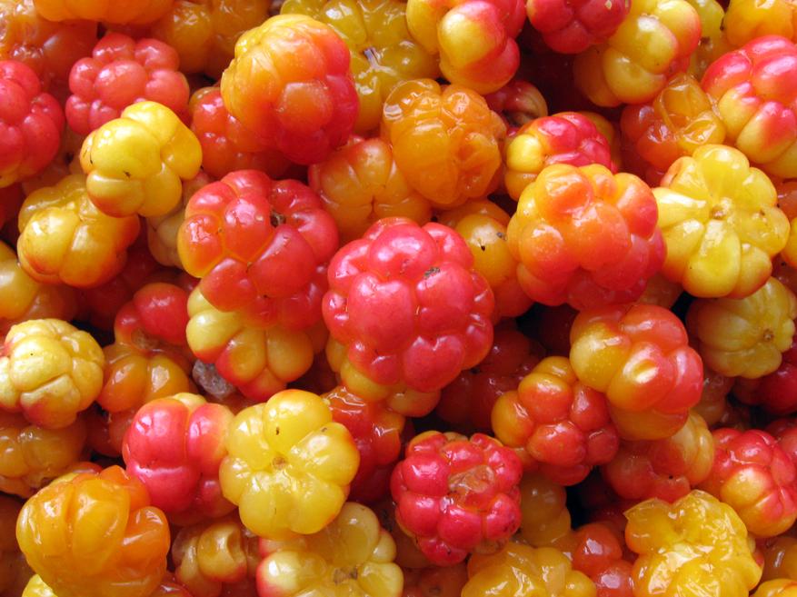Если жимолость переживает холод, то морошка в нём живёт. Эта ягода растёт на болотах Крайнего Севера и похожа на маленькое янтарное солнце. Во времена северных экспедиций морошка спасала людей от цинги — в ней рекордное количество витамина C и органических кислот. Финны делают из неё ликёры и варенье, а в Норвегии — десерты с мороженым и сливками. Вкус — необычный: что-то между малиной, брусникой и апельсином.
