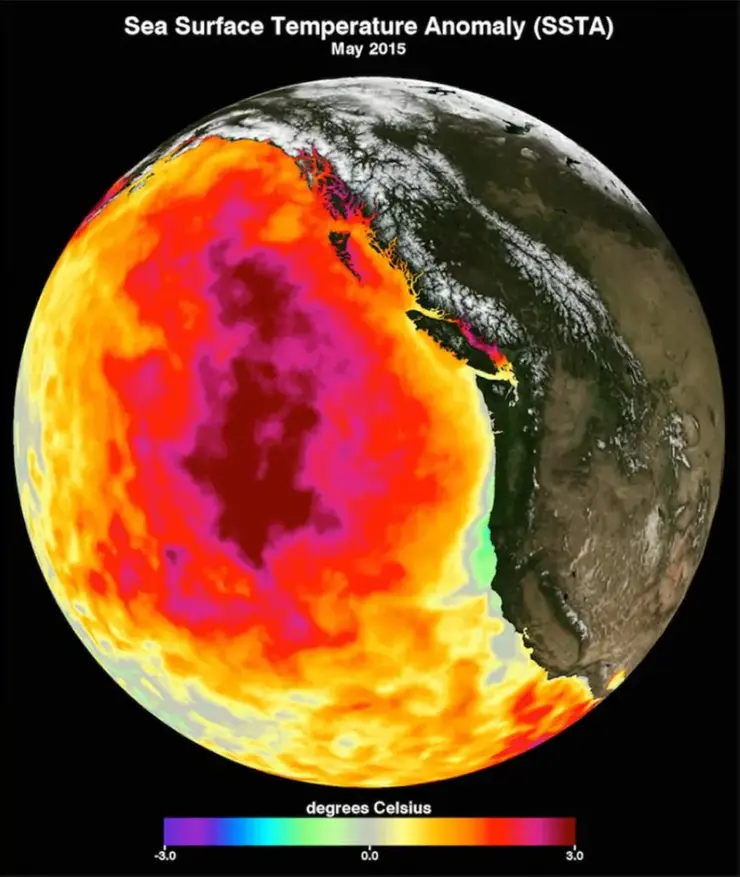 Основной причиной этого явления стало аномальное потепление океанических вод, начавшееся в 2013 году, когда плотный слой горячей воды, названный «Блоб», переместился к западному побережью США. К 2016 году температура воды превышала среднюю на 4,5 градуса на территории около 3200 километров Тихого океана.