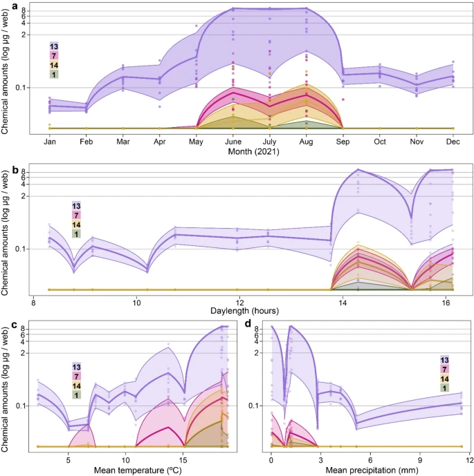 Чтобы это проверить, ученые целый год каждый месяц собирали паутину у самок в природе, и измеряли количество феромонов.