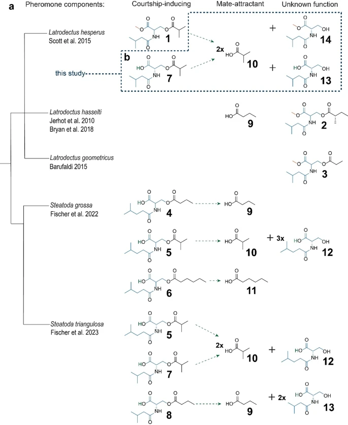 Контактные феромоны — как понятно из названия, для близкого контакта. Самец должен коснуться паутины, чтобы их почувствовать. Именно они запускают его поведение по ухаживанию. Раньше был известен один такой компонент. Ученые нашли и второй. У этих веществ очень длинные научные названия: N-3-метилбутаноил-O-метилпропаноил-L-серин метиловый эфир (будем называть его вещество 1) и его кислотная форма, N-3-метилбутаноил-O-метилпропаноил-L-серин (вещество 7).