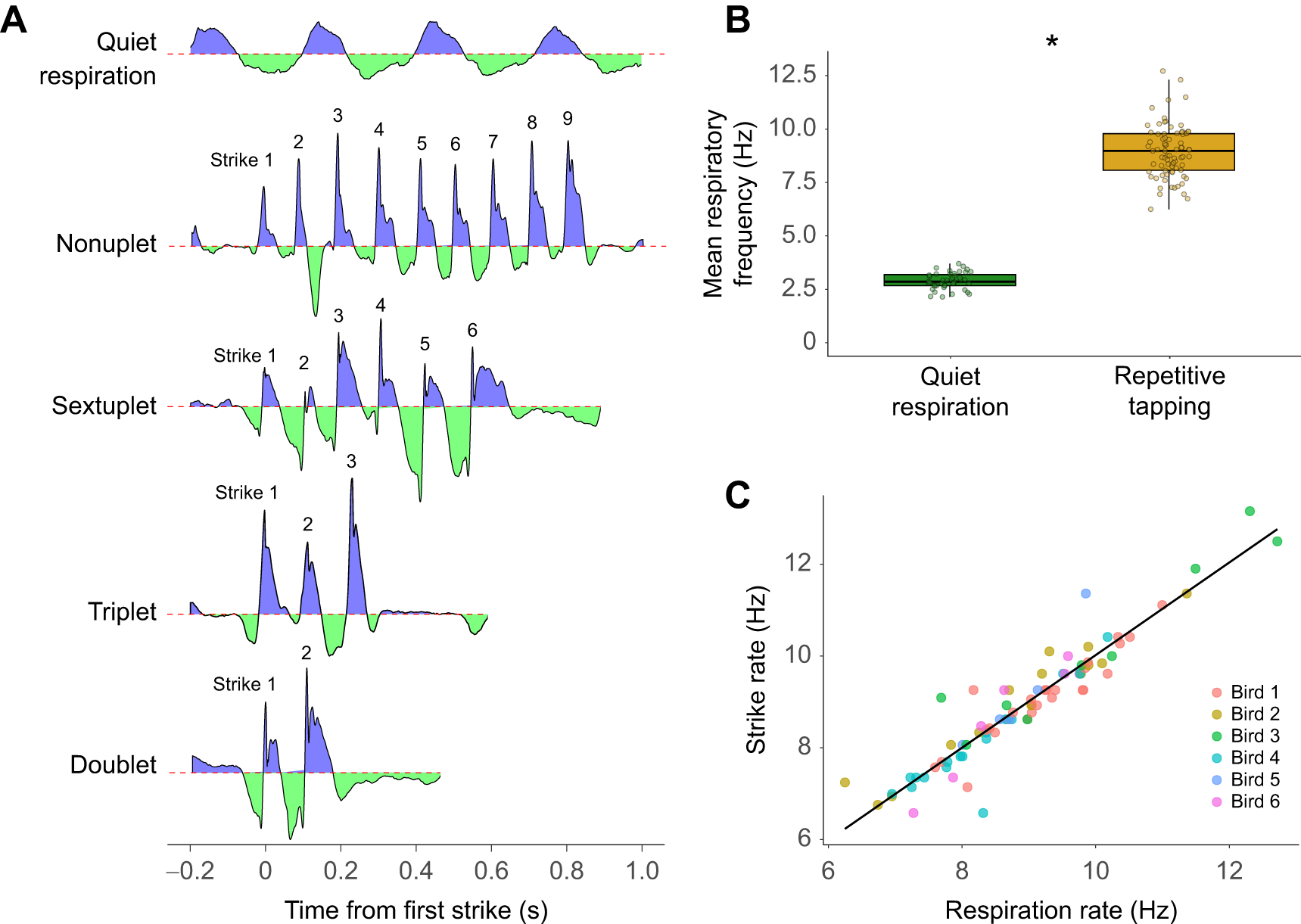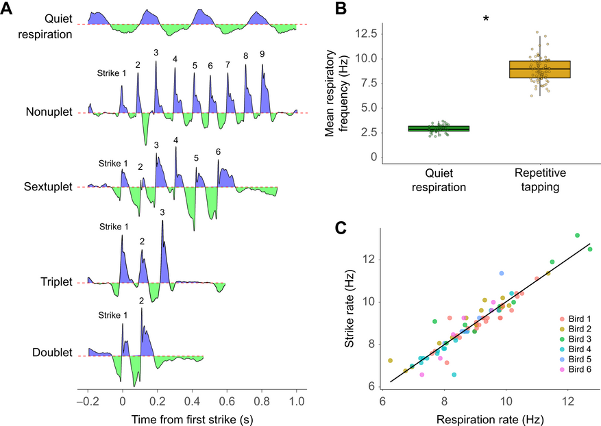 Но как быть с быстрой барабанной дробью, когда удары следуют один за другим с частотой 10-15 раз в секунду? Исследователи обнаружили, что дятел синхронизирует дыхание с ударами в соотношении один к одному. Один удар — один короткий выдох. В паузе между ударами, которая длится сотые доли секунды, он успевает сделать такой же короткий микро-вдох. Эта способность к сверхбыстрому дыханию позволяет ему поддерживать высокий темп без кислородного голодания — механизм, который ранее наблюдали у певчих птиц во время исполнения быстрых трелей.