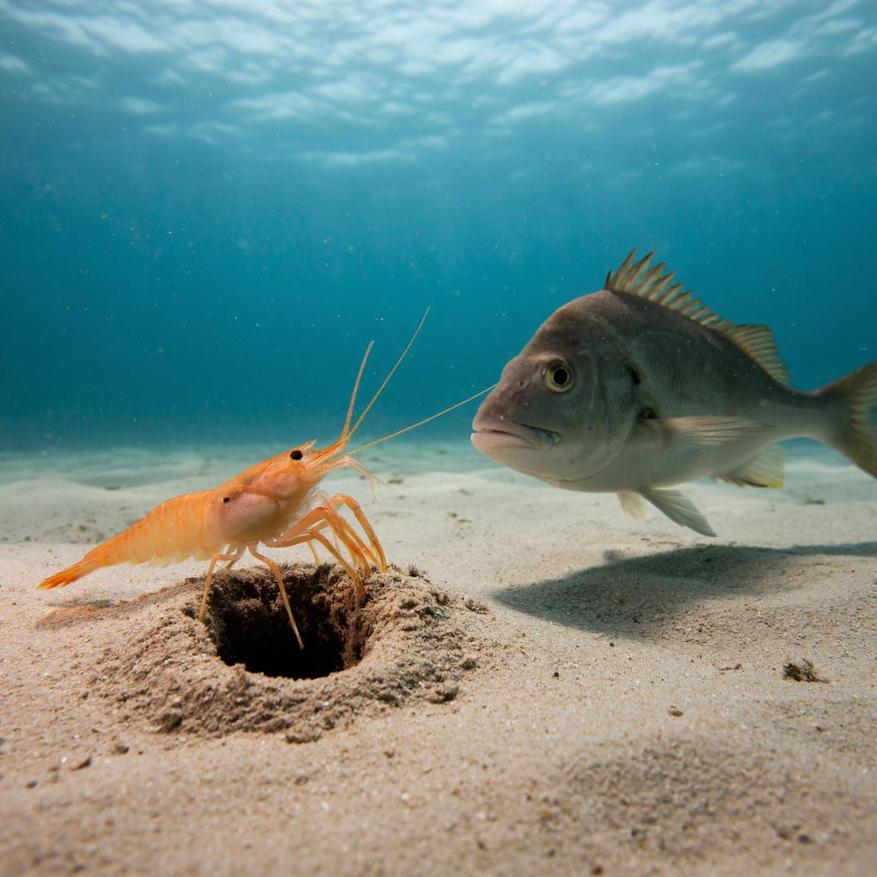 Креветка-альфеус практически слепа, но она отличный строитель — роет норки в песке. У рыбки-бычка отличное зрение, но он не умеет строить жилища. Вместе они образуют идеальную команду: креветка роет и обустраивает норку, а бычок стоит на страже. Когда приближается опасность, рыбка касается хвостом усиков креветки — это сигнал тревоги. Креветка всегда держит один усик на бычке, чтобы не пропустить предупреждение. Они вместе прячутся в норке и вместе выходят на кормёжку. Настоящая слепая вера и дружба.