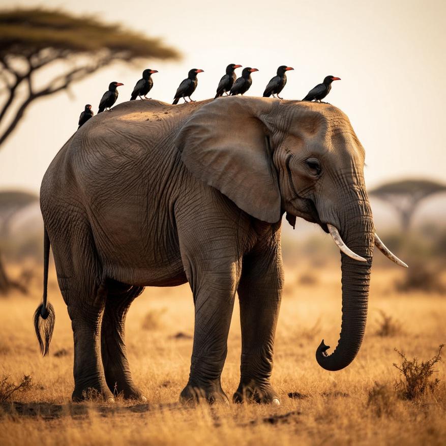 Птицы-носороги (или буйволовые птицы) — это пернатые спутники крупных африканских животных, которые превратили чистку в искусство. Они садятся прямо на спины слонов, буйволов, носорогов и выклевывают из их шкуры клещей, паразитов и личинок. Слоны спокойно позволяют птицам копошиться даже в самых чувствительных местах — возле глаз и ушей. Но птицы не просто санитары — они ещё и система раннего оповещения! Заметив опасность, они резко взлетают и издают тревожные крики, предупреждая своих массивных хозяев. Слон получает чистку и охранную сигнализацию, птица — обед и безопасную наблюдательную вышку. Все довольны.