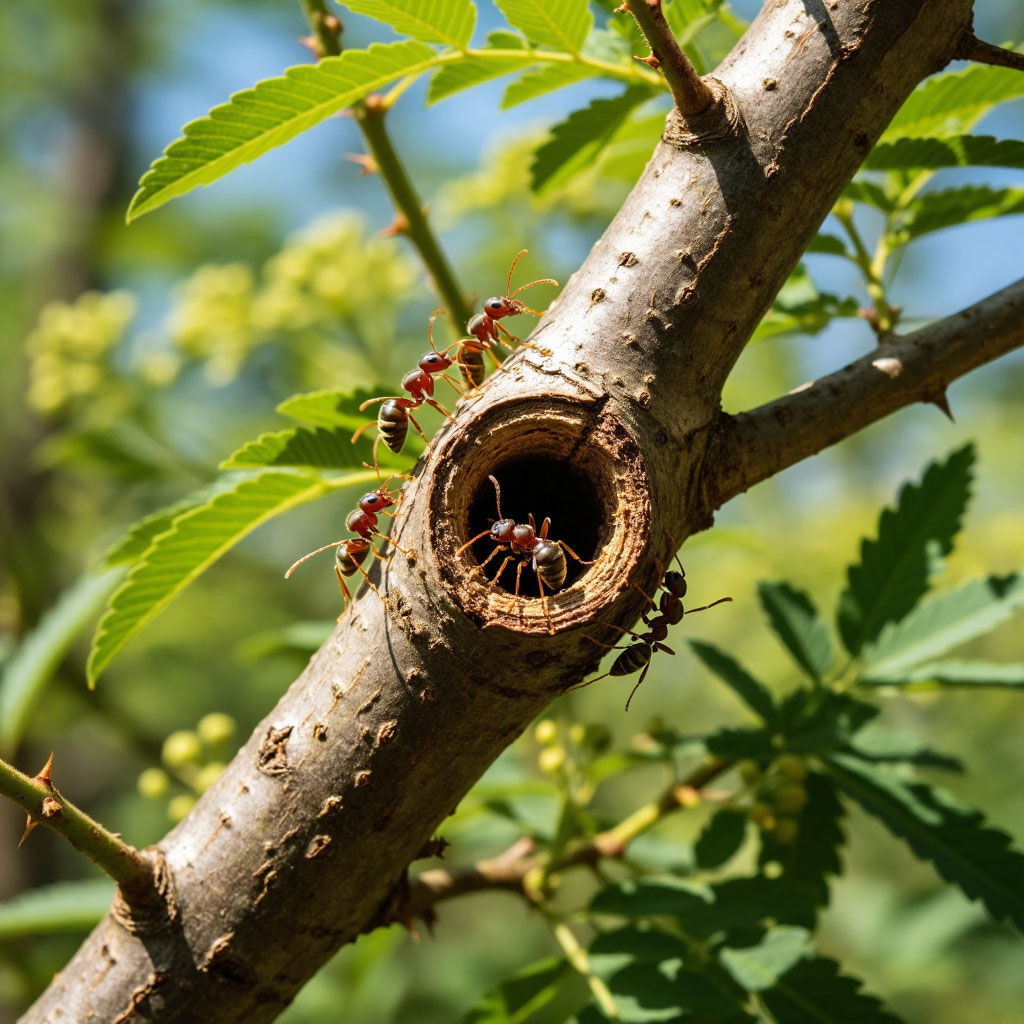 Акация предоставляет муравьям жильё в своих полых шипах и кормит их специальным нектаром и питательными тельцами на листьях. Взамен муравьи яростно защищают дерево от всех травоядных — от гусениц до жирафов. Но это ещё не всё: муравьи выкусывают любые растения, которые пытаются вырасти рядом с акацией, создавая вокруг «своего» дерева мёртвую зону. Получается, что акация нанимает целую армию садовников и охранников, расплачиваясь с ними жильём и едой.