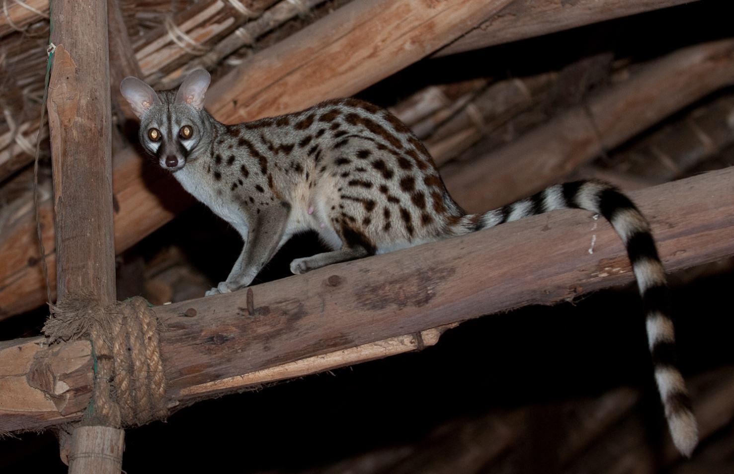 Ее большие глаза светятся в темноте, а подвижные уши улавливают каждый шорох. Это идеальный набор для ночной охоты. А еще генетты — отличные верхолазы: их когти цепляются за кору деревьев, а хвост работает как руль. Иногда они даже спят на ветках, свернувшись в пушистый клубок.
