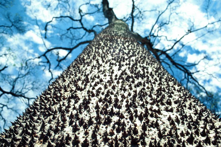Хура настоящий гигант, легко растущий на 20-30 метров в высоту. Узнать ее можно по характерной коре, усеянной теми самыми конусообразными шипами — природной защитой от любопытных животных. Крупные, сердцевидные листья образуют густую крону, особенно пышную в сезон дождей.