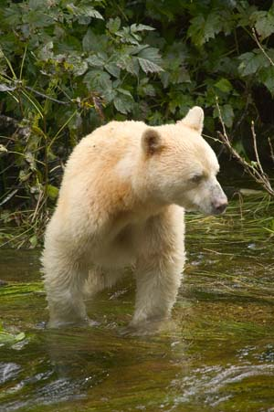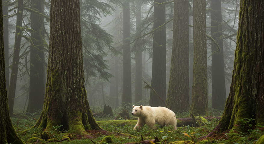 Кермодский медведь (Ursus americanus kermodei) — подвид американского чёрного медведя, обитающий исключительно на западном побережье Британской Колумбии. Его дом — Великий Медвежий лес, один из крупнейших сохранившихся умеренных дождевых лесов мира. Здесь, среди густых хвойных зарослей, рек и туманных островов, кермодский медведь выделяется своей необычной внешностью. Примерно 10-20% этих медведей рождаются с белой или кремовой шерстью, что делает их редким природным феноменом. Остальные имеют классический чёрный окрас, но могут нести ген, отвечающий за белый цвет.