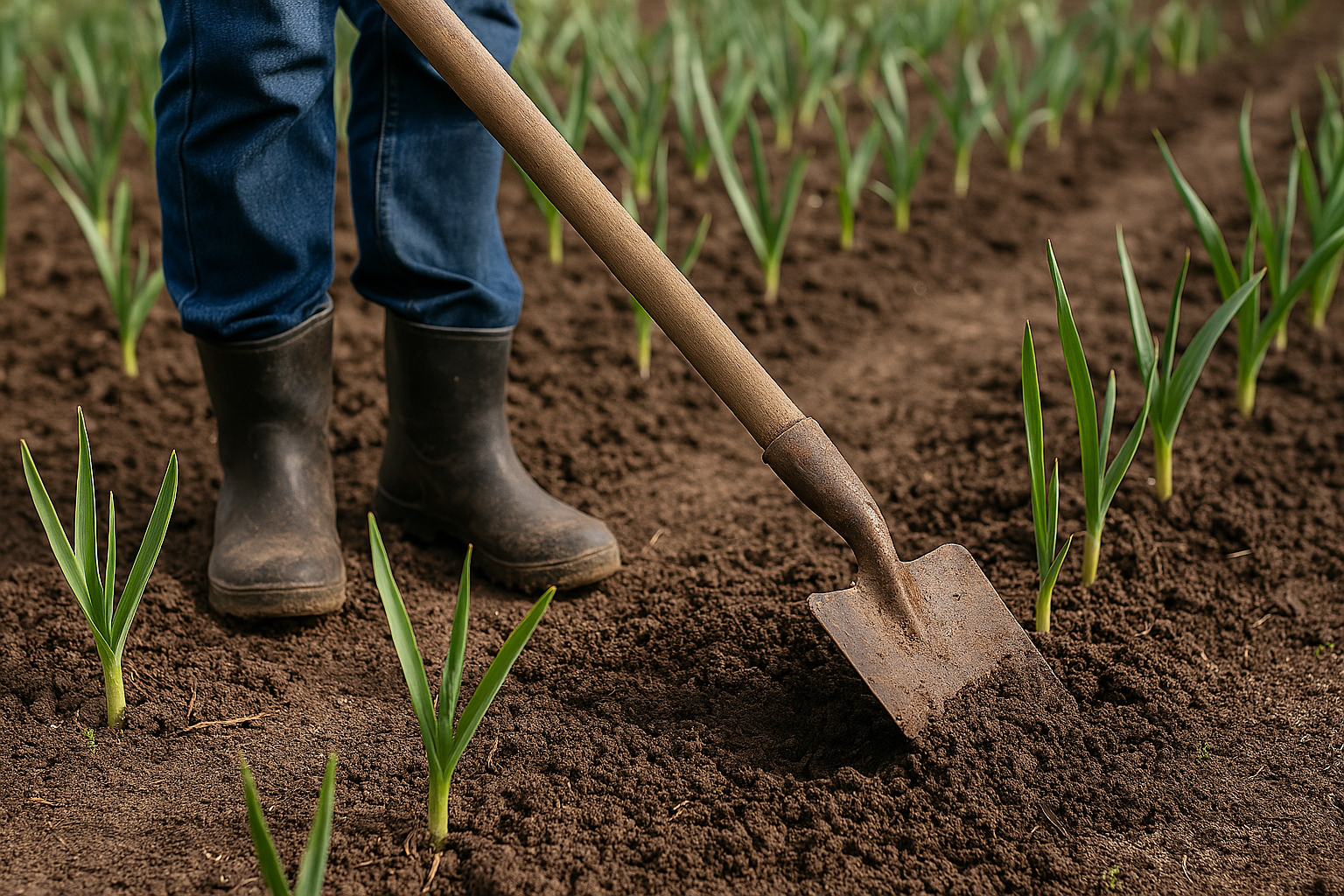 Качество и результативность подкормки напрямую зависят от подготовки почвы. Сначала следует аккуратно прорыхлить междурядья на глубину до 6-8 см, чтобы земля могла свободно впитывать воду и удобрения. Важно тщательно убрать все сорняки, так как они конкурируют с чесноком за питательные вещества и влагу. За несколько дней до внесения удобрений почву рекомендуется обильно увлажнить теплой водой (примерно +18-20 °C).