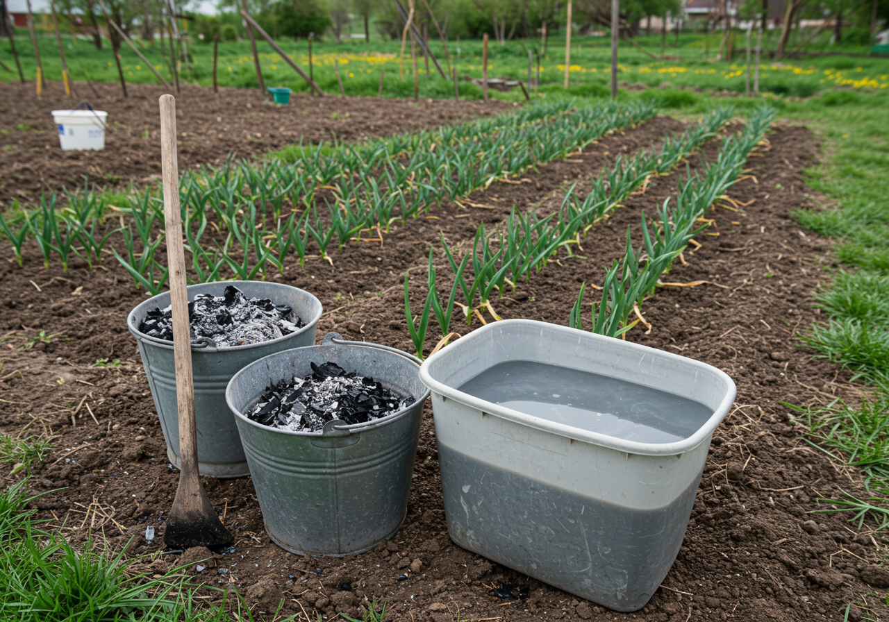 Садоводы, предпочитающие органическое земледелие, часто выбирают древесную золу. Это натуральное удобрение богато калием, кальцием, магнием и другими микроэлементами, которые стимулируют развитие чеснока. Для приготовления раствора берут стакан золы на 10 литров воды, тщательно перемешивают и оставляют настаиваться на двое суток, периодически взбалтывая. После процеживания добавляют еще литр чистой воды и используют по 0,5 литра под каждое растение.