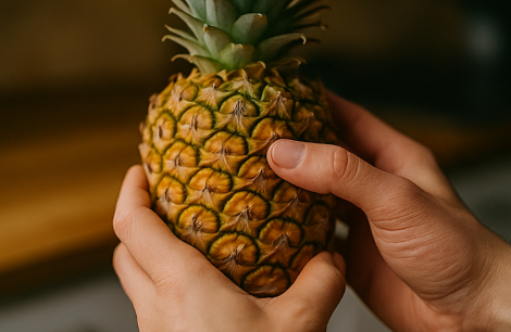 Ананас выдаёт зрелость упругим, но не каменным корпусом и лёгким сладким ароматом у основания. Листья розетки должны легко выдёргиваться, но при этом оставаться упругими на ощупь. Если корпус слишком жёсткий, плод ещё не дошёл до вкусового пика; если же проминается при захвате ладонями, мякоть внутри уже может быть волокнистой и переспевшей.