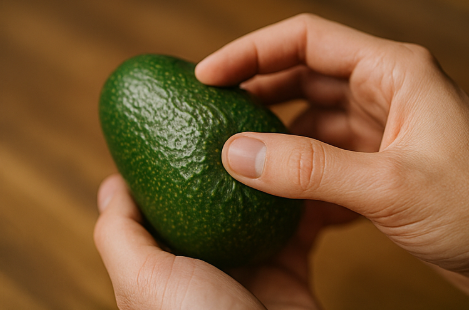 Авокадо — один из самых капризных в выборе. У спелого плода зона у плодоножки поддаётся лёгкому нажатию и быстро восстанавливает форму. Если осторожно снять маленькую «шапочку» плодоножки, под ней должна быть зеленоватая, а не коричневая мякоть. Твёрдый авокадо лучше оставить дозревать в бумажном пакете вместе с бананом — выделяемый этилен ускорит процесс.