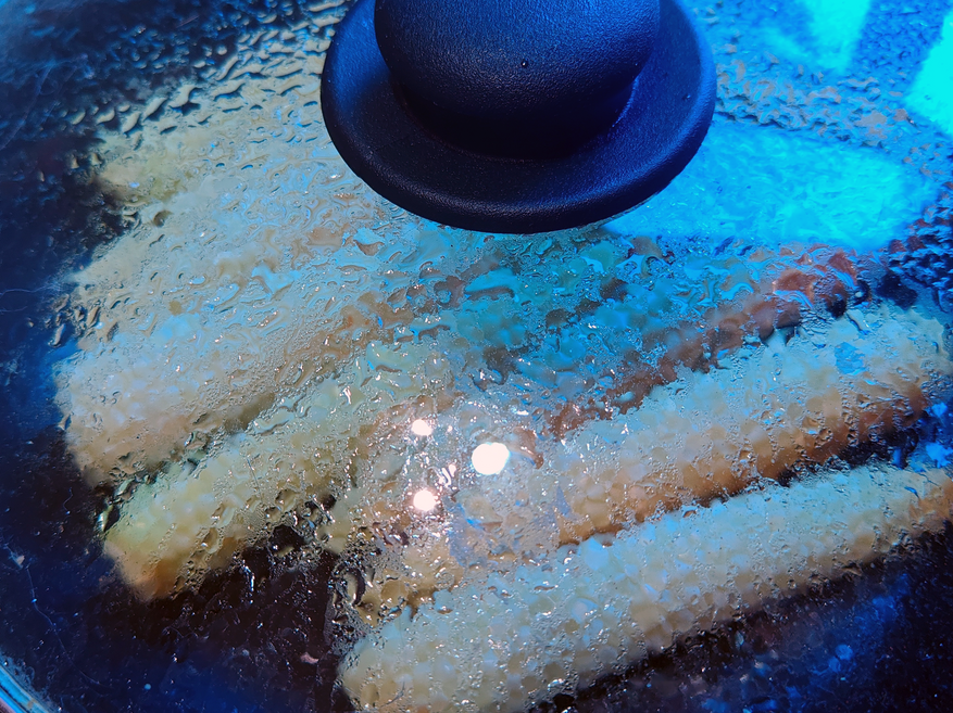- Когда масло разогреется, аккуратно выложите на сковороду очищенные початки. Старайтесь уложить их в один слой, чтобы они равномерно контактировали с горячей поверхностью. Как только последний початок окажется на сковороде, не мешкая ни секунды, накройте её крышкой. Этот момент — ключевой.