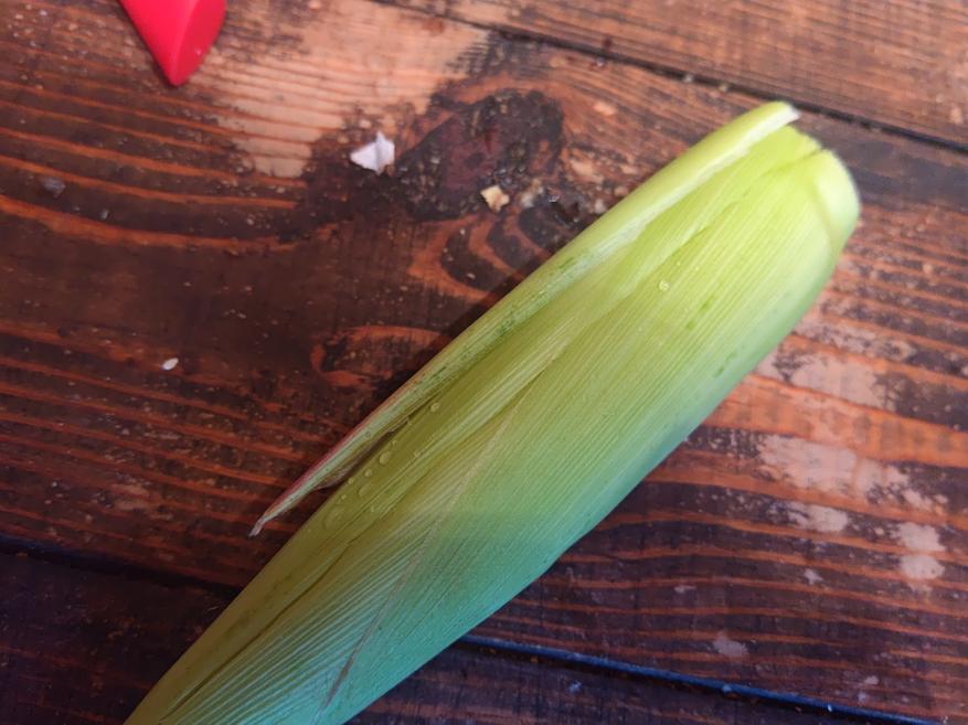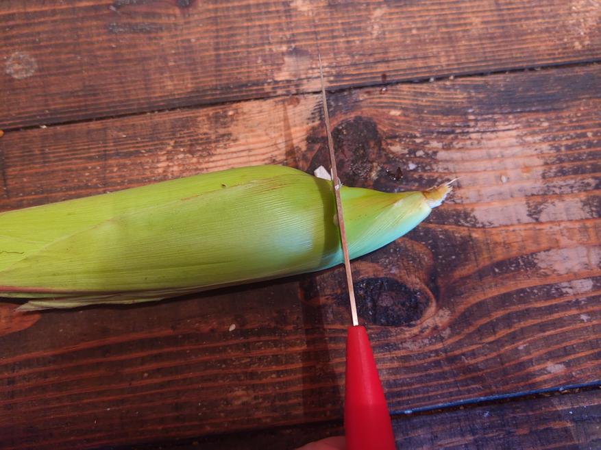 - Далее следует самый деликатный момент. Положите початок на бок и, придерживая его одной рукой, кончиком ножа сделайте неглубокий продольный надрез вдоль всей длины. Аккуратно! Важно прорезать только слои листьев, не задев сам нежный початок внутри. Если вы планируете кукурузу тушить, небольшие повреждения зёрен некритичны. Но если собираетесь варить, будьте предельно осторожны. Повреждённые зёрна при варке могут выпустить крахмал и придать бульону, а затем и самой кукурузе, неприятный горький привкус.