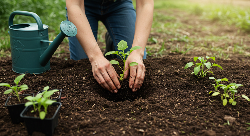 Рассаду высаживайте, когда почва прогреется до +7 °C, а у растений будет 4-6 настоящих листьев — обычно в конце апреля или конце июля. Формируйте лунки по схеме 60х40 см (для мелких сортов 40х30 см), полейте и перенесите рассаду с комом земли. Торфяные кубики сажайте целиком, слегка надрезав. Не заглубляйте корневую шейку. После посадки накройте грядки агроволокном для защиты от похолоданий ниже +13 °C.