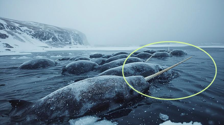 Также стоит добавить, что несмотря на то, что хрупкая на вид структура бивня кажется не слишком подходящей для защиты или нападения, её функциональность тоже нельзя недооценивать. Например, бивень помогает нарвалам взаимодействовать с ледяными покровами. Они могут использовать его, чтобы пробивать отверстия во льду, создавая доступ к воздуху. Но, возможно, самое удивительное — это способность бивня анализировать химический состав воды. С его помощью нарвалы находят кормовые зоны, определяя концентрацию нужных веществ.
