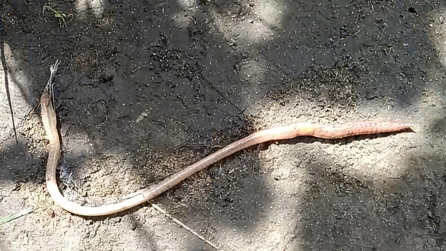Перекапывал у себя на даче старые грядки и вдруг, лопата извлекла на свет не просто дождевого червяка, а настоящего гиганта, больше похожего на маленькую змейку — толстого, мясистого, сантиметров тридцать в длину.