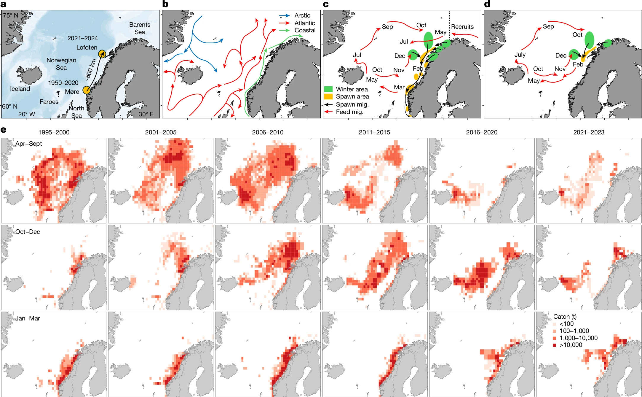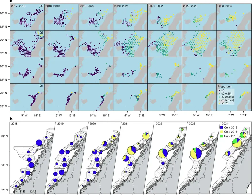 И вот тут на сцену выходит когорта 2016 года. Это поколение сельди, достигнув зрелости, оказалось в ситуации, когда «учителей» почти не осталось. Старые маршруты на юг, к Мёре, оказались, по сути, забыты. Вместо этого, они, похоже, проложили новый путь — на север, к Лофотенам. И, что самое интересное, этот новый маршрут стал доминирующим уже к 2021 году, когда именно эта «потерявшая память» когорта составила более половины всей нерестующей популяции.