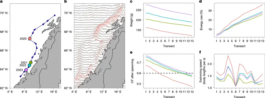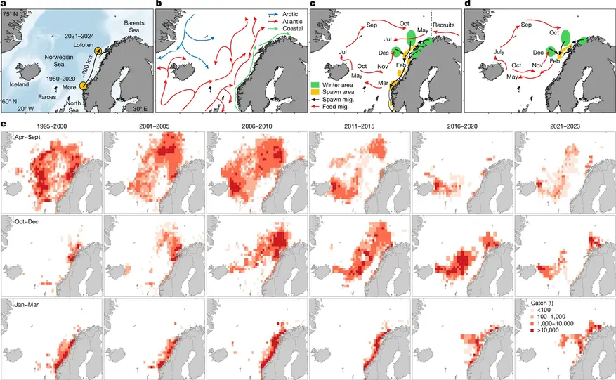 Исследование, опубликованное в престижном журнале Nature, рисует неутешительную картину. Анализ данных, собранных с 1995 по 2024 год — а это и промысловая статистика, и результаты акустико-траловых съемок, и данные с тысяч помеченных рыб, — показал резкое сокращение «старой гвардии». Биомасса опытных нерестующих особей упала на шокирующие 68% всего за несколько лет (с 4 млн тонн в 2019 до 1,3 млн тонн в 2023 году). Молодняку просто не за кем стало следовать.