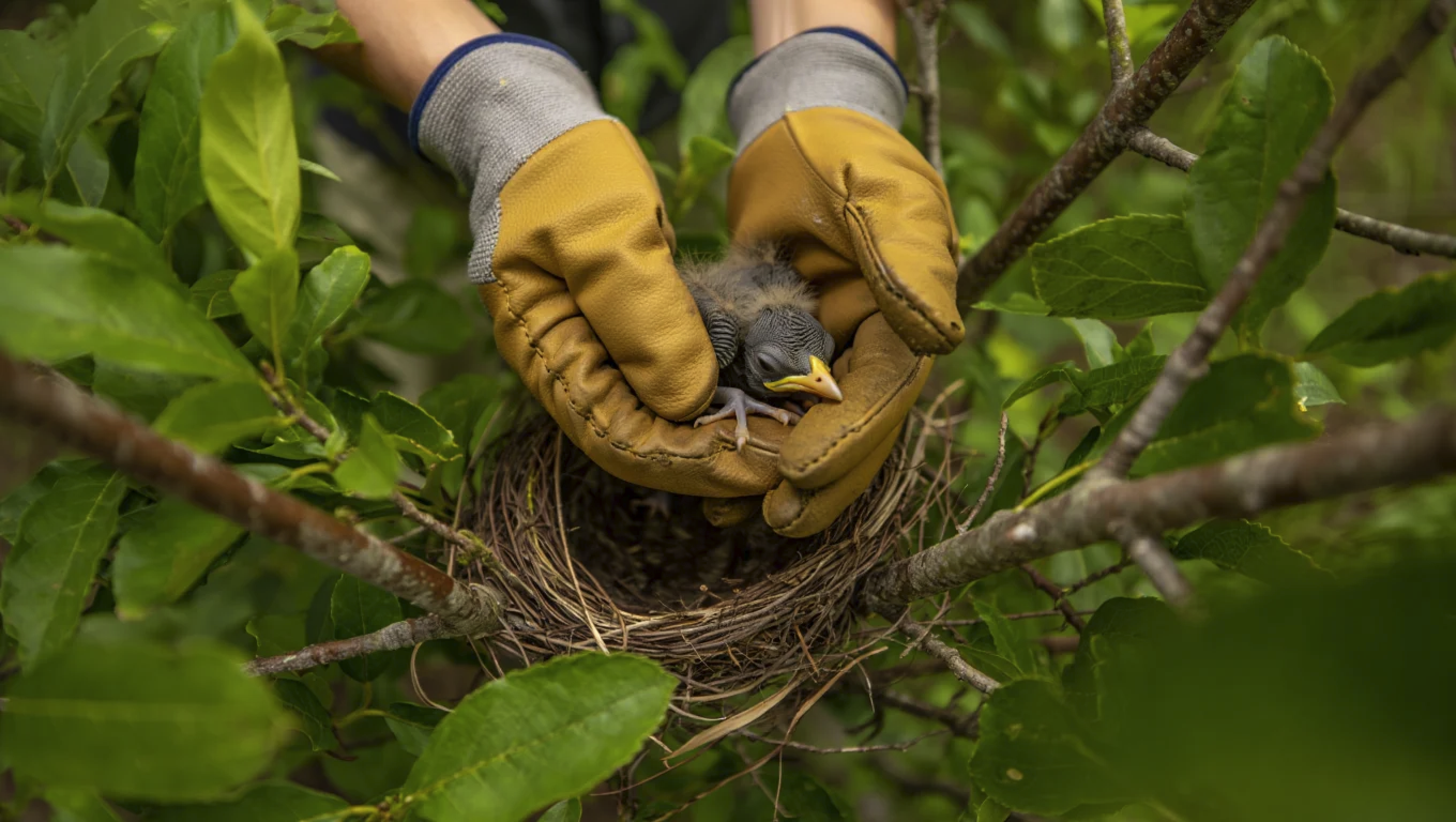 - Возвращаем домой (и рушим мифы!): Если гнездо найдено и доступно, самый лучший вариант — вернуть птенца обратно. И тут внимание: забудьте этот древний миф, будто родители откажутся от птенца, учуяв человеческий запах! Шиан Денни из Королевского общества защиты птиц авторитетно заявляет: «У птиц, на самом деле, ужасное обоняние». Так что смело (но нежно!) берите птенца. Правда, перчатки всё же лучше надеть — исключительно из соображений вашей гигиены, птицам наши запахи, по большей части, безразличны.
