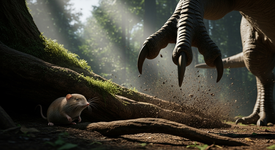 Именно здесь кроется ирония эволюции этой истории. Пока динозавры сотрясали землю, в их тени разворачивалась другая драма. Наши далекие предки — ранние млекопитающие размером с современную мышь — вели скрытный ночной образ жизни. Их оружием были не клыки и размеры, а превосходное обоняние, вибриссы для ориентации в полной темноте и компактное тело, идеально приспособленное для нор. Для гигантов мезозоя это была чужая, непонятная и, как показала история, заранее проигранная война за будущее планеты.